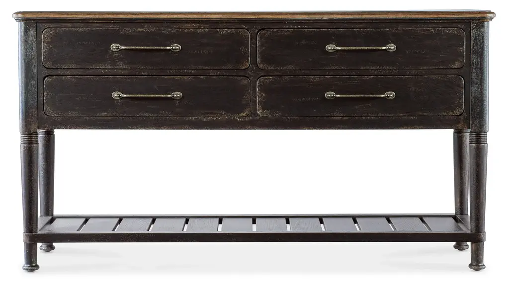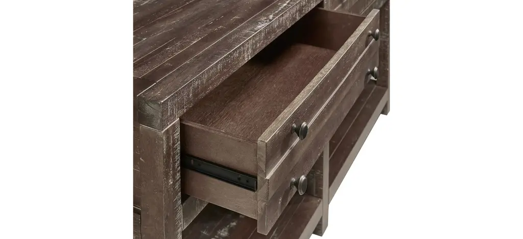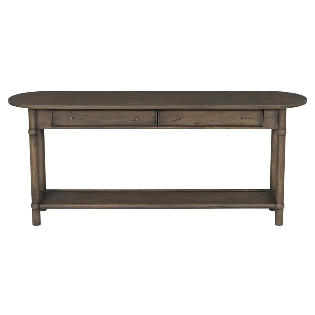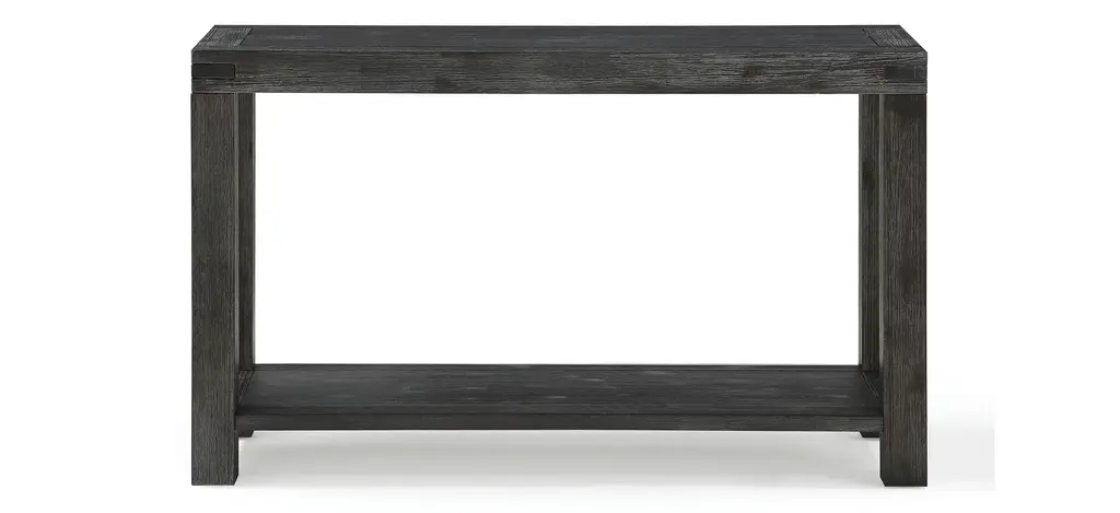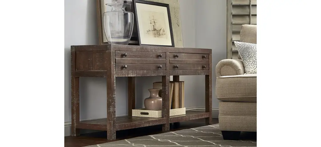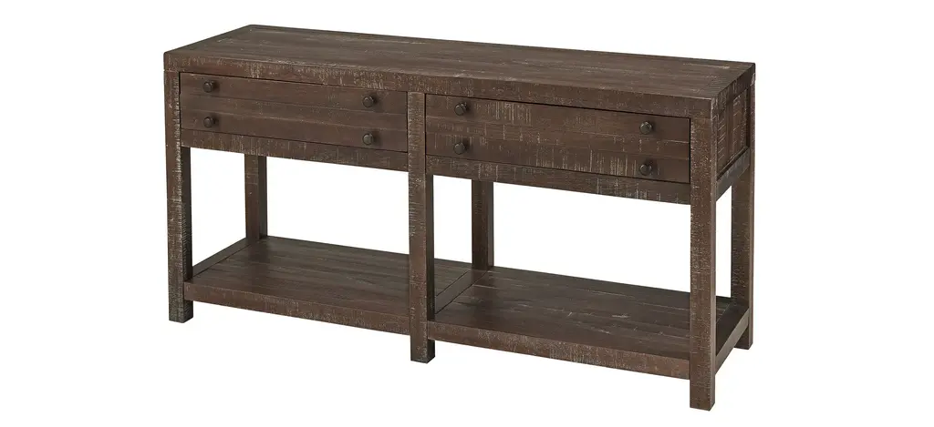 The rough and tumble Hanover sofa table is crafted from solid hardwood, featuring naturally roughhewn planks with heavy saw marks, pitting and wane. A 9-step finish uses glaze to highlight the wood grain and a light wash to simulate the patina of age. What results is a rustic collection with a uniquely vintage feel.