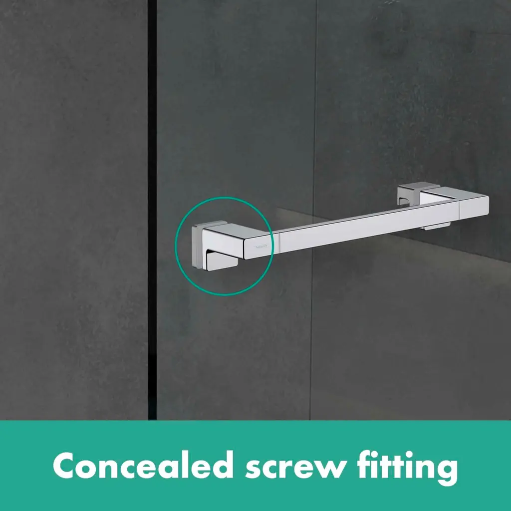 High quality shower door handle from hansgrohe in brushed black chromeWith the AddStoris shower door handle from hansgrohe the bathroom is both functional and visually enhanced. It not only opens and closes the shower door reliably, but also serves as a practical towel rail. The modern and reduced design impresses with a clear, expressive design. It fits particularly well with geometric bathroom fittings, such as the hansgrohe line Metropol.Nice that the hansgrohe quality keeps what the high-quality design promises: the AddStoris shower door handle is made of metal and therefore particularly durable. This helps in the sustainable use of resources and reduces the plastic content in the environment. The brushed surface in brushed black chrome is easy to clean. It corresponds to the color of the hansgrohe special surfaces for fittings (FinishPlus). So everything fits perfectly together.Easy to install.The shower door handle is placed on the door from the inside and outside and fastened with two screws. The hole spacing is approx. 13.8 in; the Diameter of the drill hole is approx 0.5 in. The glass thickness can be between 0.25-0.5 in.Hansgrohe 41759 Features: