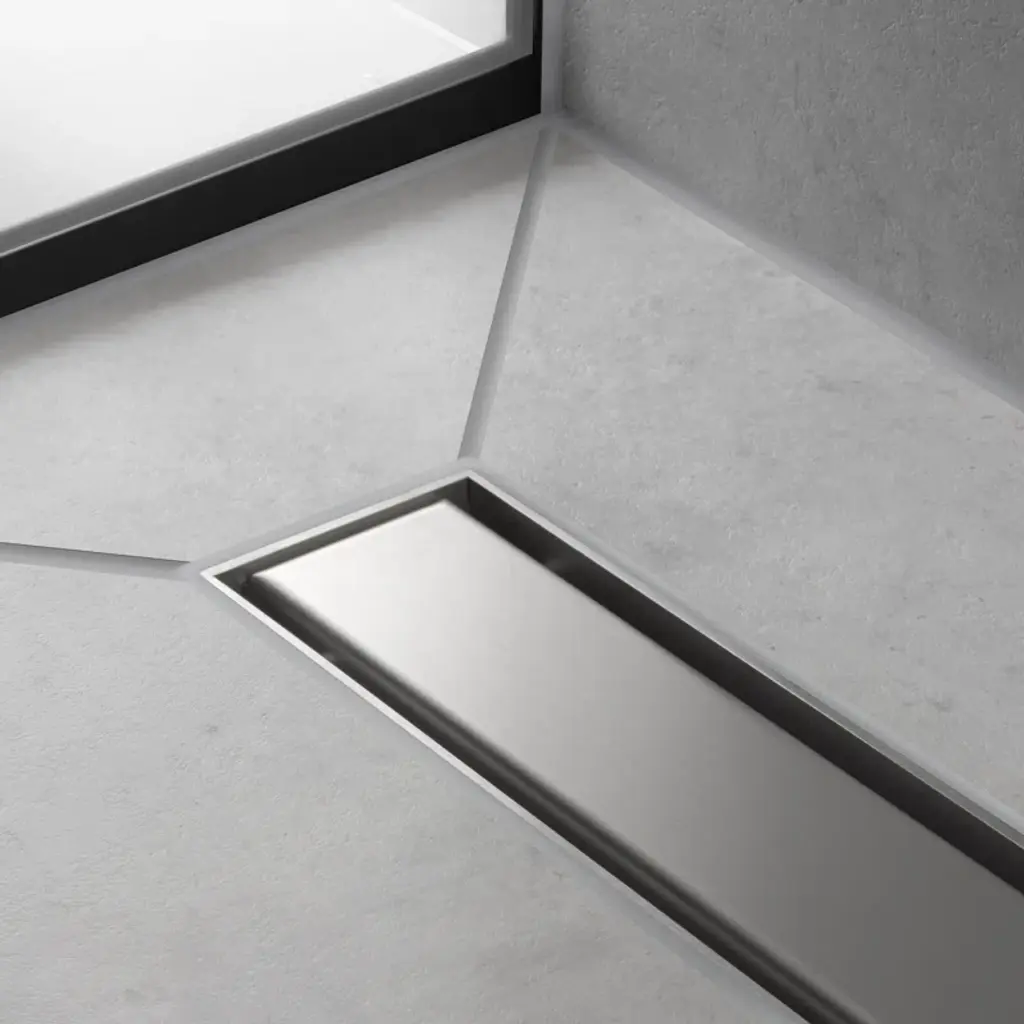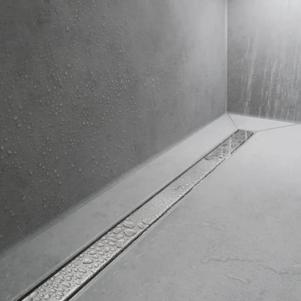 The RainDrain Match 23 5/8" drain trim (finish set) in matte black from hansgrohe is a flexible drainage solution for installation flush with the back wall or freestanding in the shower area. The shower drain trim's matte black finish goes particularly well with modern bathroom designs. Alternatively, the channel can be tiled at the back also (max. tile thickness 18 mm). The vertically adjustable frame offers flexibility in the drain barrier also: so the system can be adjusted to the height of the tiles – for floor-level installation without trip hazard. The result meets the requirements of a barrier-free shower area. The innovative high-tech silicone membrane also ensure that hair and dirt do not get stuck. This helps prevent annoying blockages in the drain. It is easy: They are installed on a complete set with pre-assembled sealing fleece (sold separately).