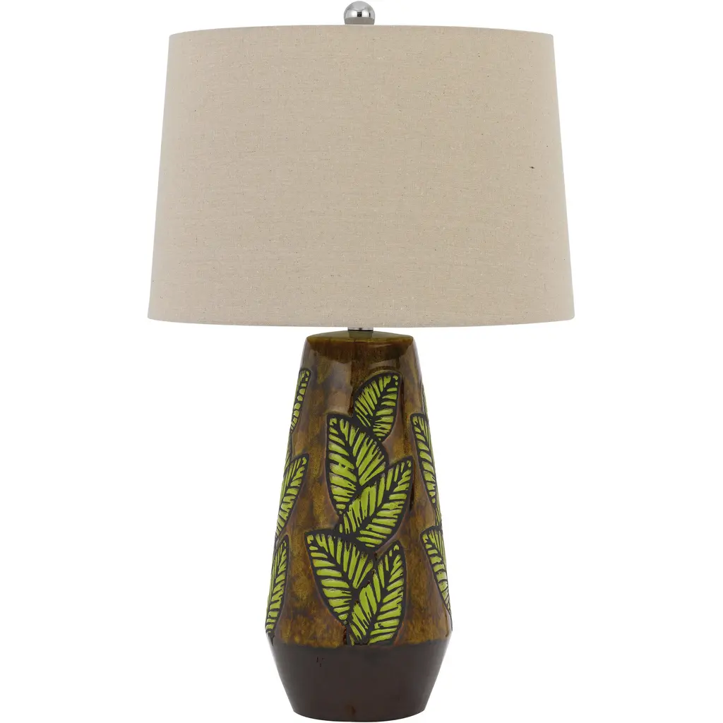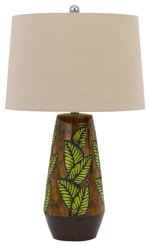 Bold, earthy, and full of life—our Hanson Ceramic Table Lamp is a vibrant celebration of nature and handcrafted charm.The artisan-style ceramic base features hand-painted leaf motifs in lush green tones, set against a richly glazed brown backdrop that adds warmth and texture. Each sculpted detail evokes the feel of a sunlit forest floor, while the natural linen shade provides a soft, inviting glow. A polished finial tops off the look with a touch of modern contrast.Perfect for boho, eclectic, or nature-inspired interiors, this lamp brings organic energy and artistic flair to any space.