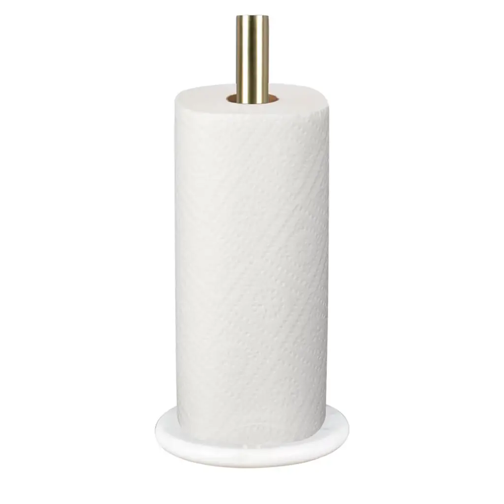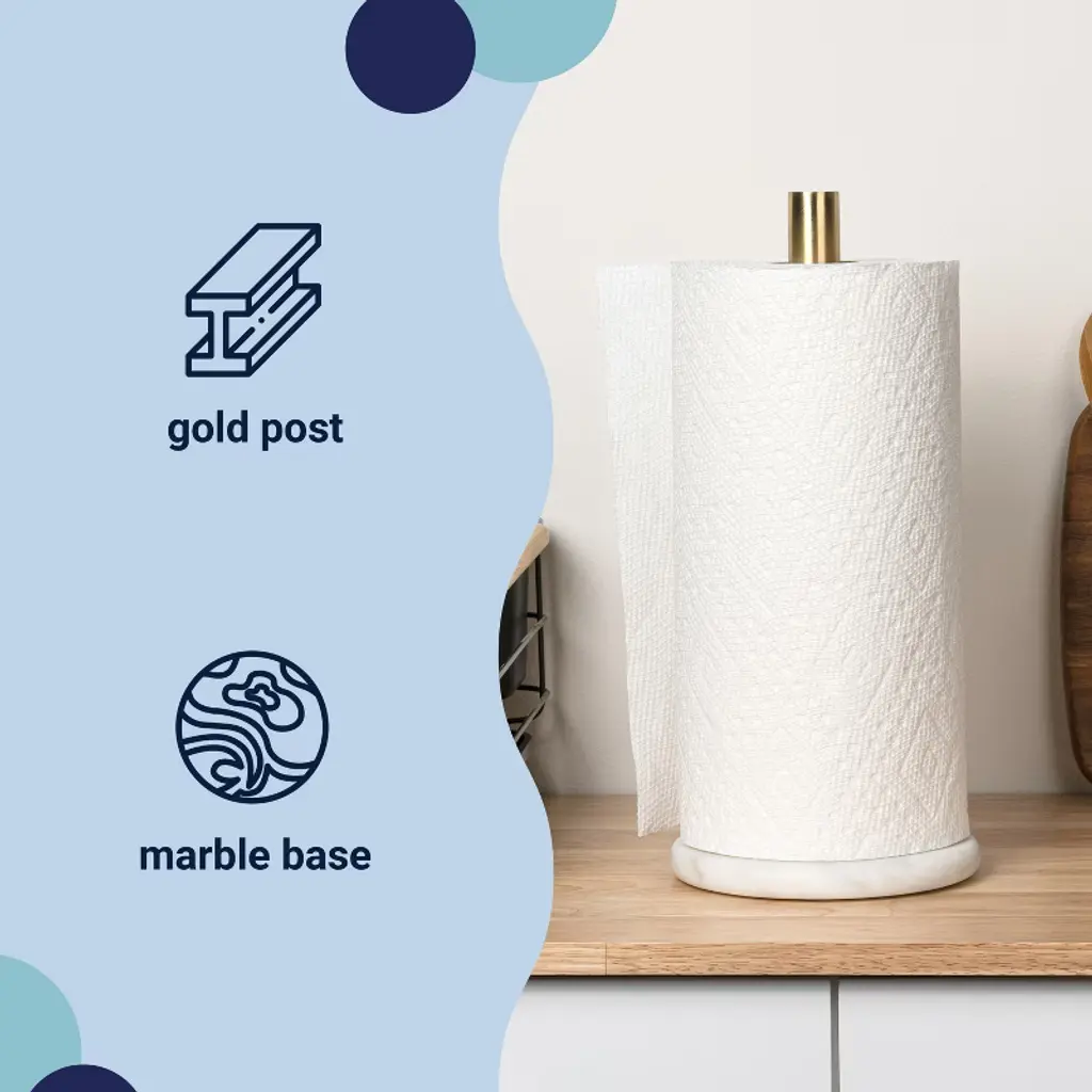 Happimess Avery Modern Classic Metal With Non Slip Weighted Marble Base Paper Towel Holder, White/gold