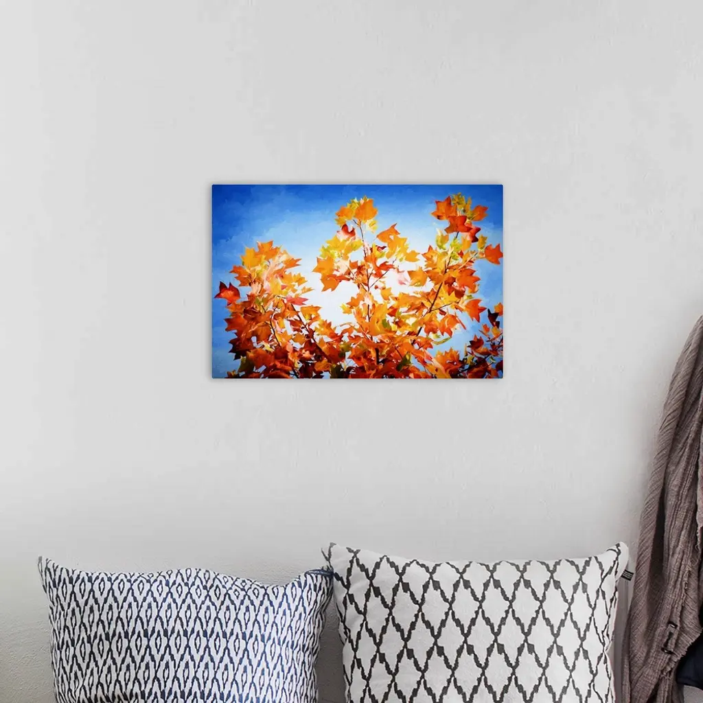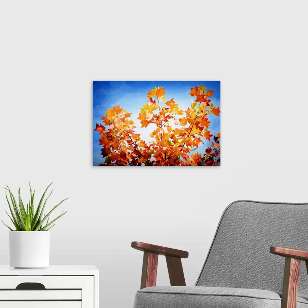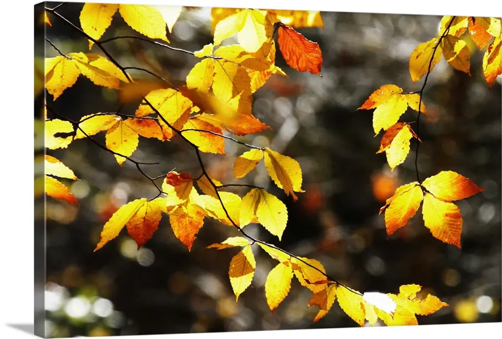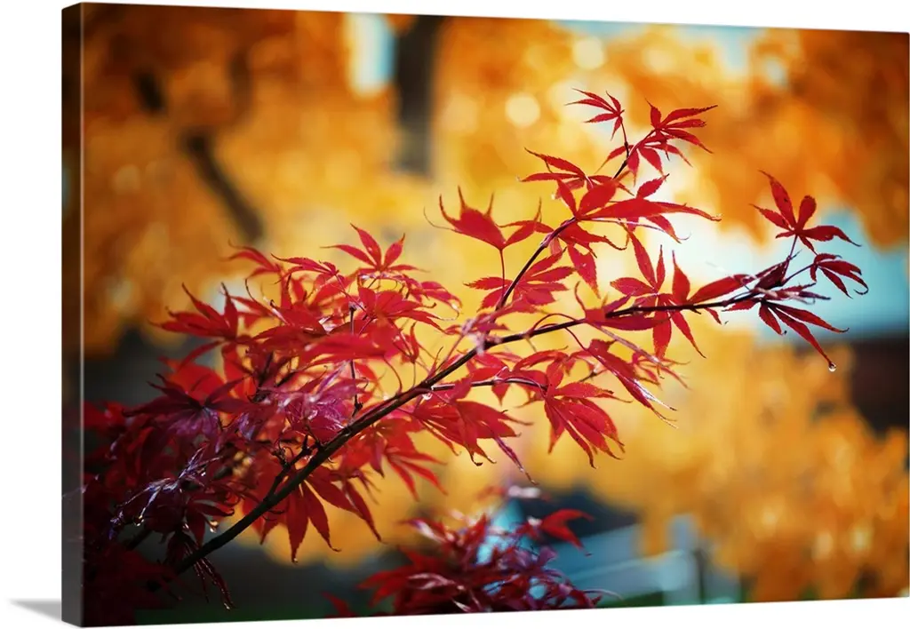 A photograph of autumn leaves on a branch against a blue sky.