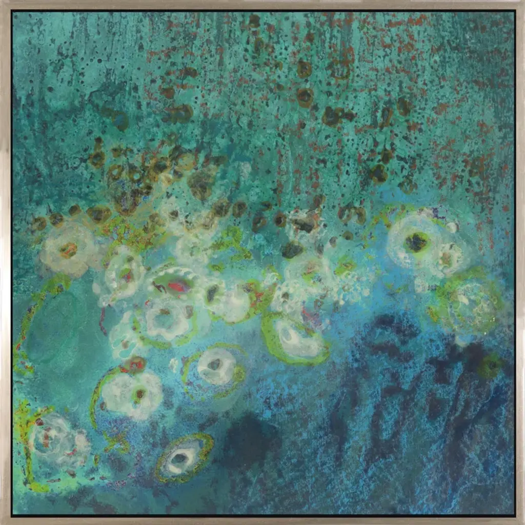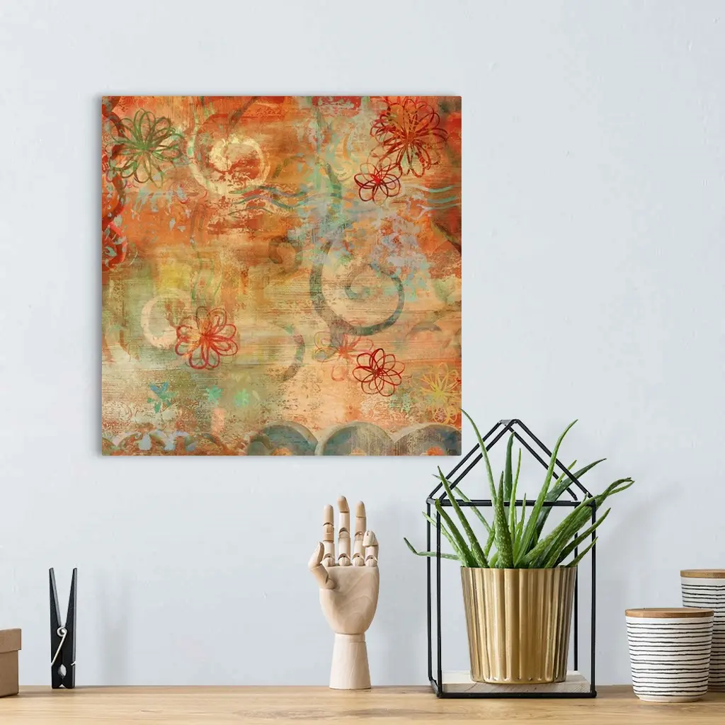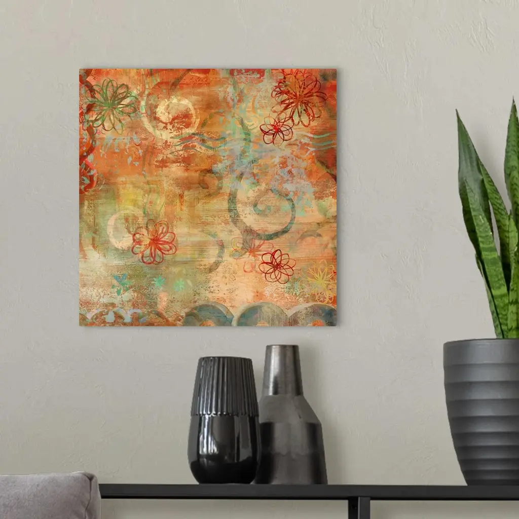 Square abstract art with warm colors, hints of cool blues, and floral illustrations.