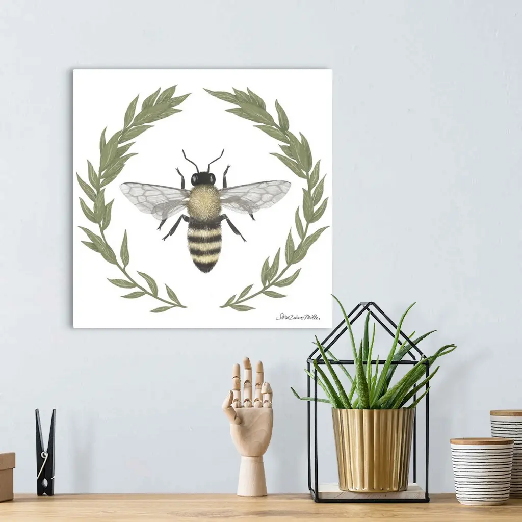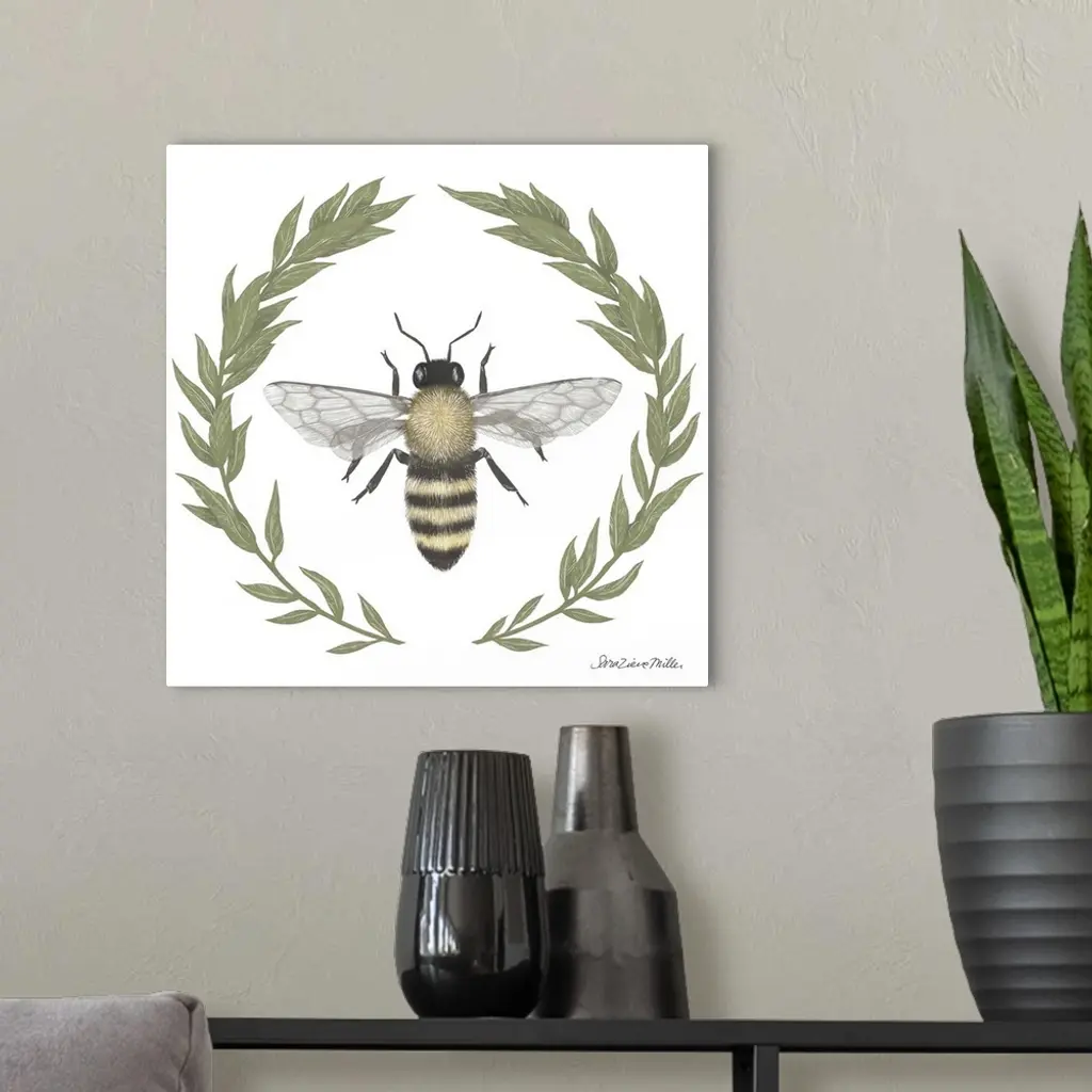 Square illustration of a bumblebee framed with a wreath of leaves.