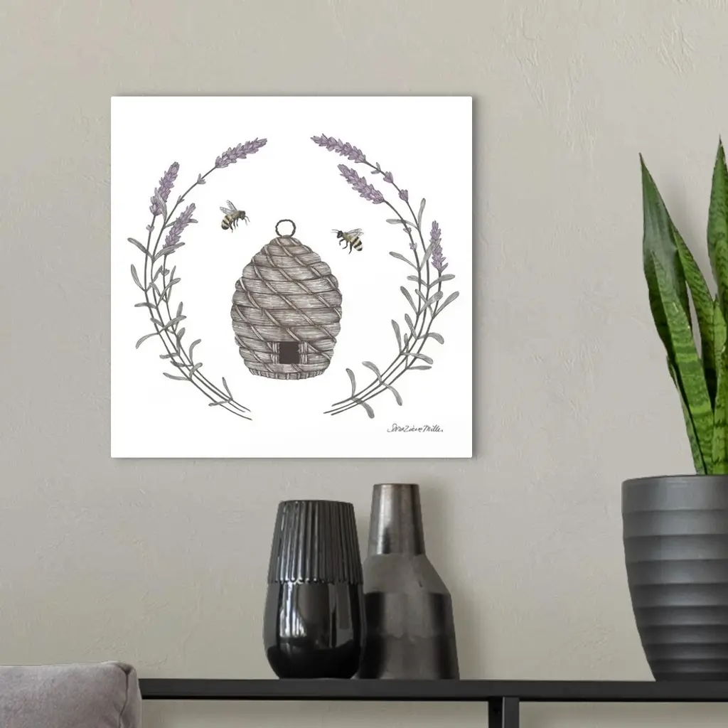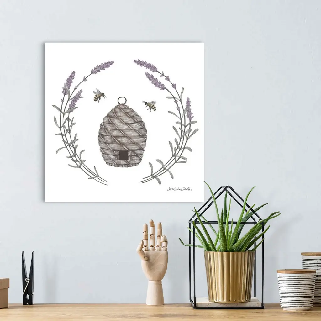 Square illustration of a bumblebee hive framed with a wreath of lavender.