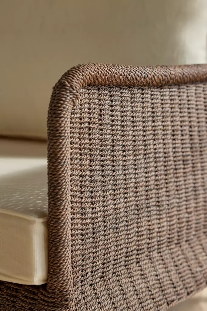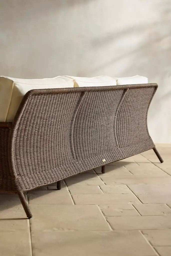 Handmade especially for terrain from durable poly rattan, this outdoor sofa pairs gracefully curved lines with a deep, comfortably cushioned seat thats perfect for relaxing on the patio or beside the pool. Seats three comfortably.
