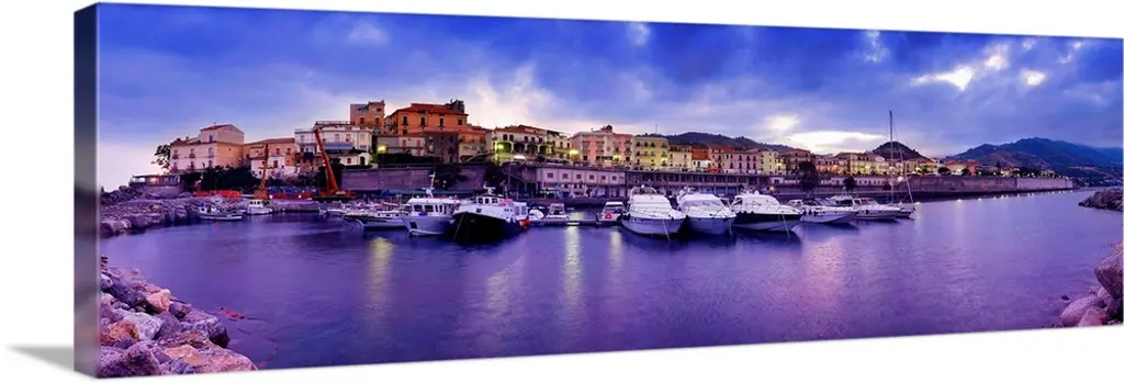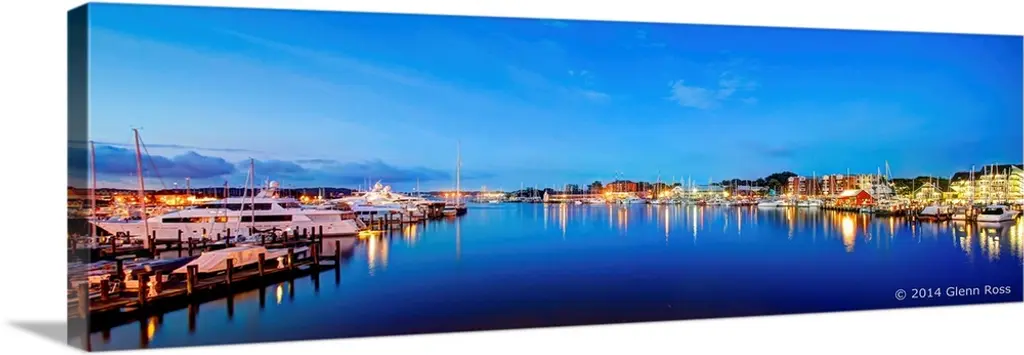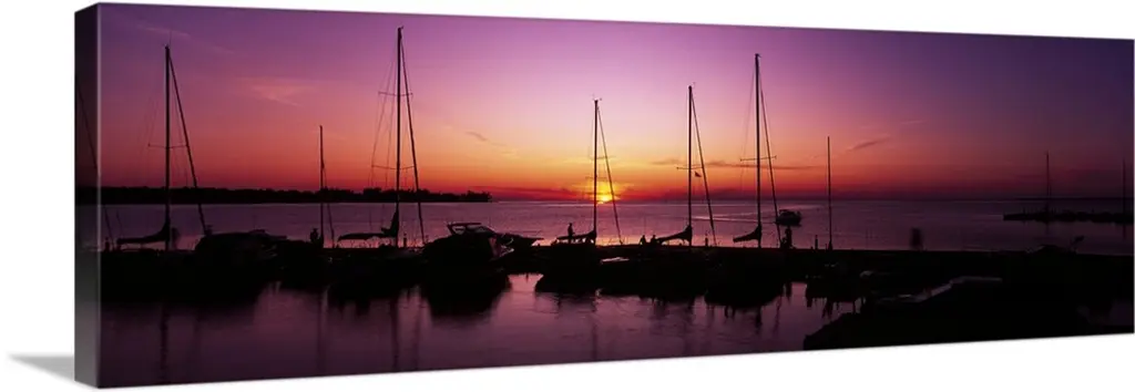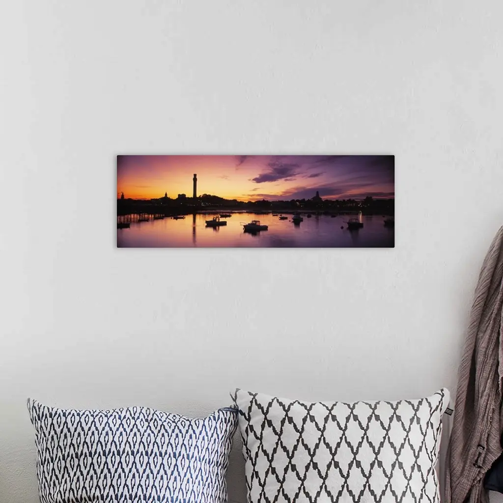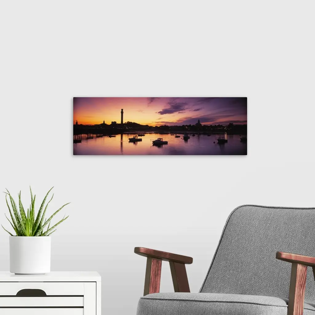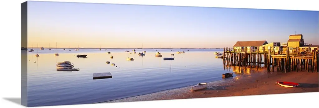 Oversized photograph of the sun setting on the horizon as many boats in a harbor are silhouetted in Cape Cod, Massachusetts.