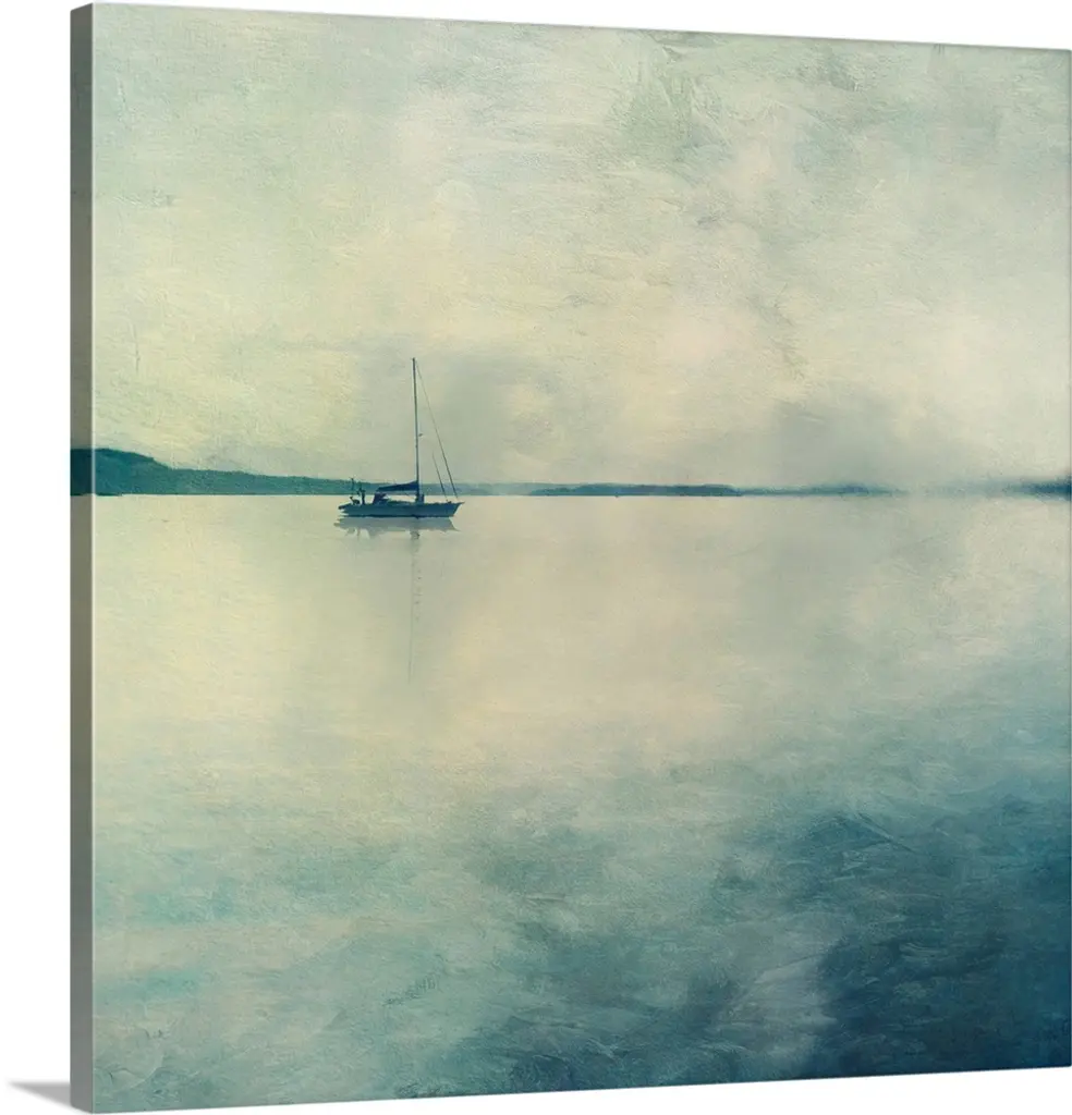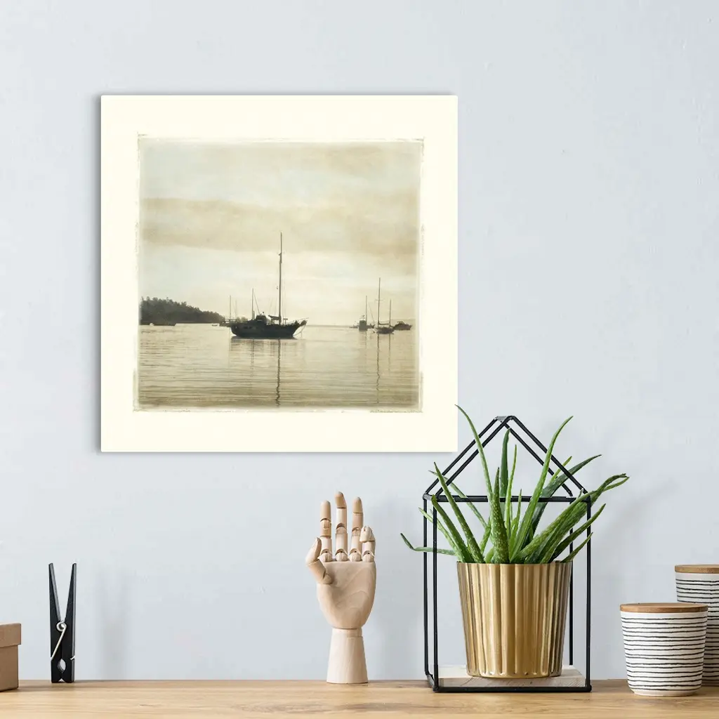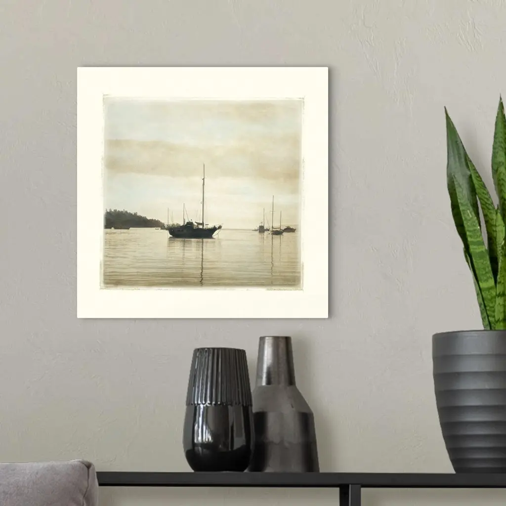 Big canvas of a square picture of boats floating in calm water.