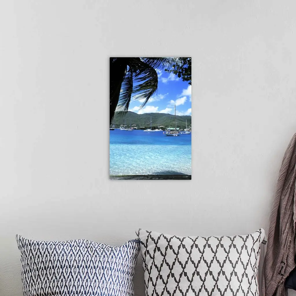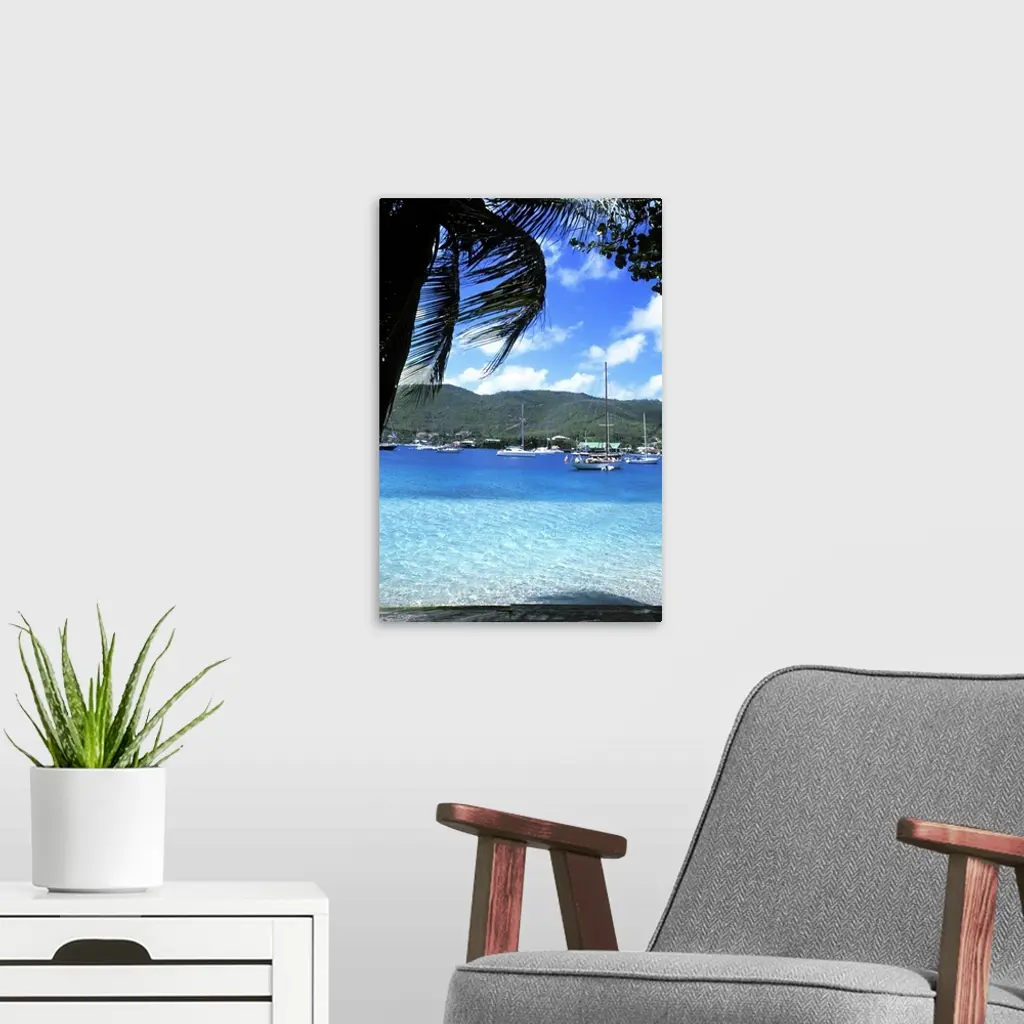 Harbor, palms, blue water at Port Elizabeth in Bequia, Grenadines.