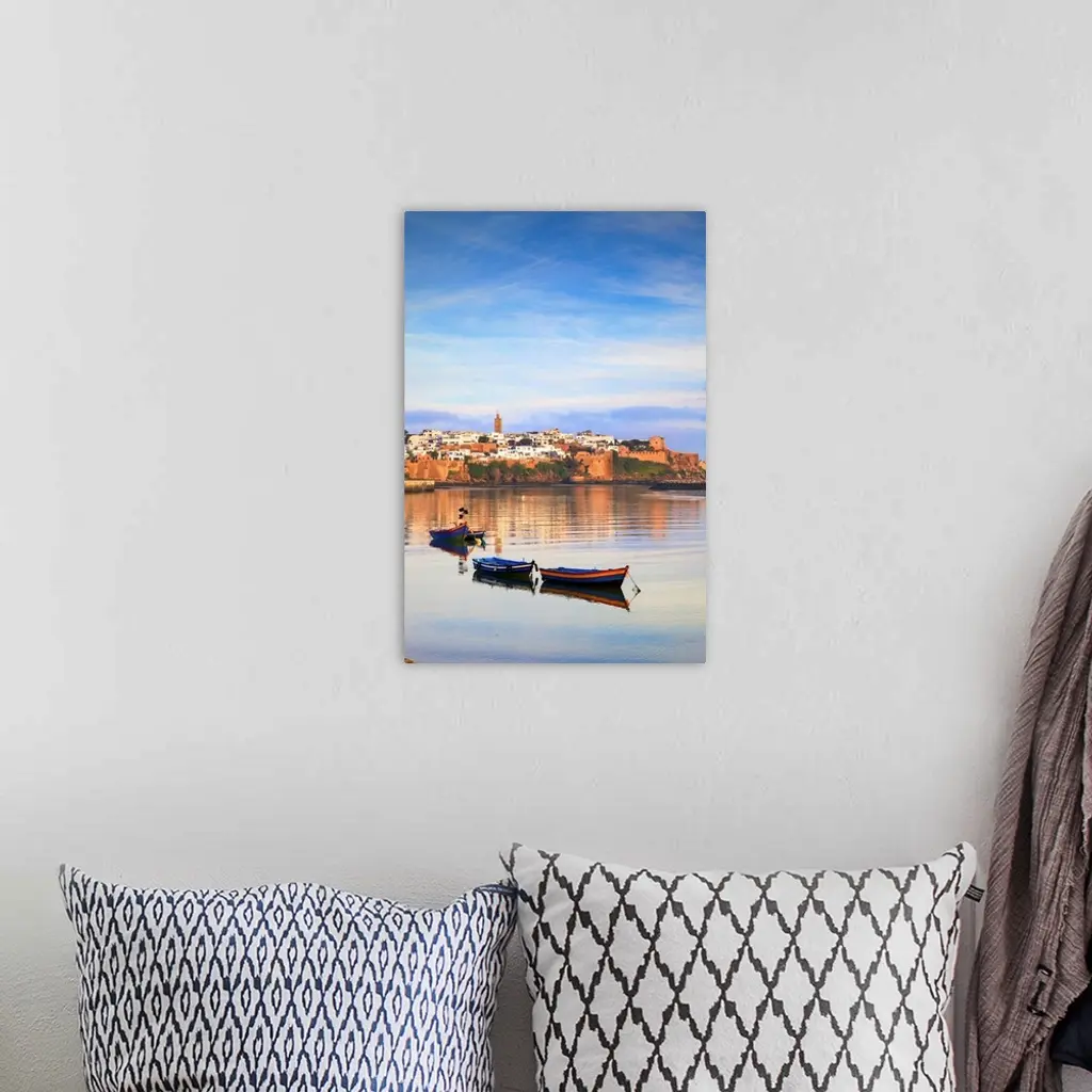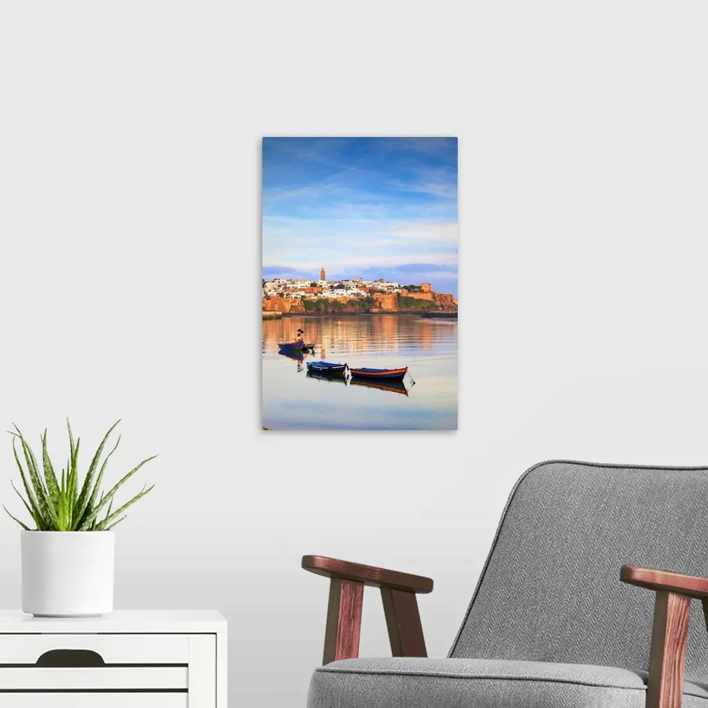 Harbour and Fishing Boats with Oudaia Kasbah and Coastline in Background, Rabat, Morocco, North Africa.