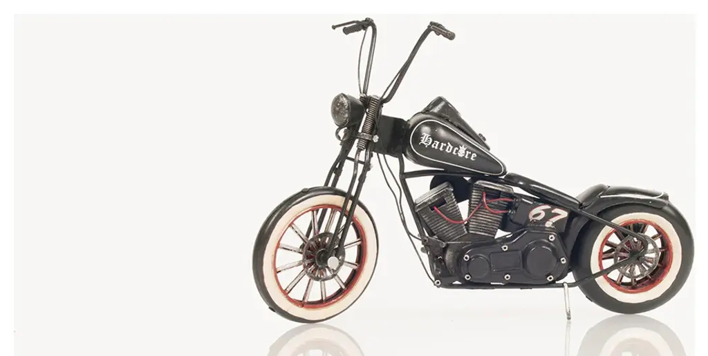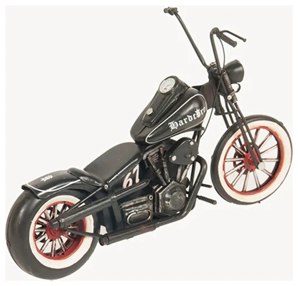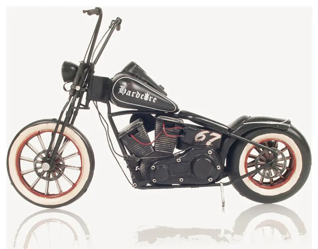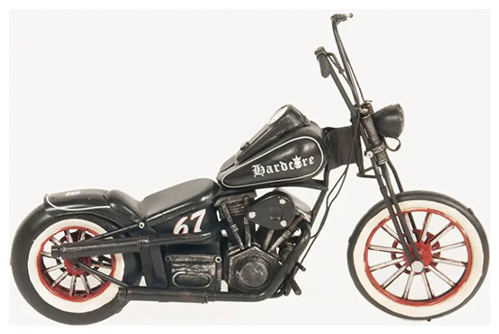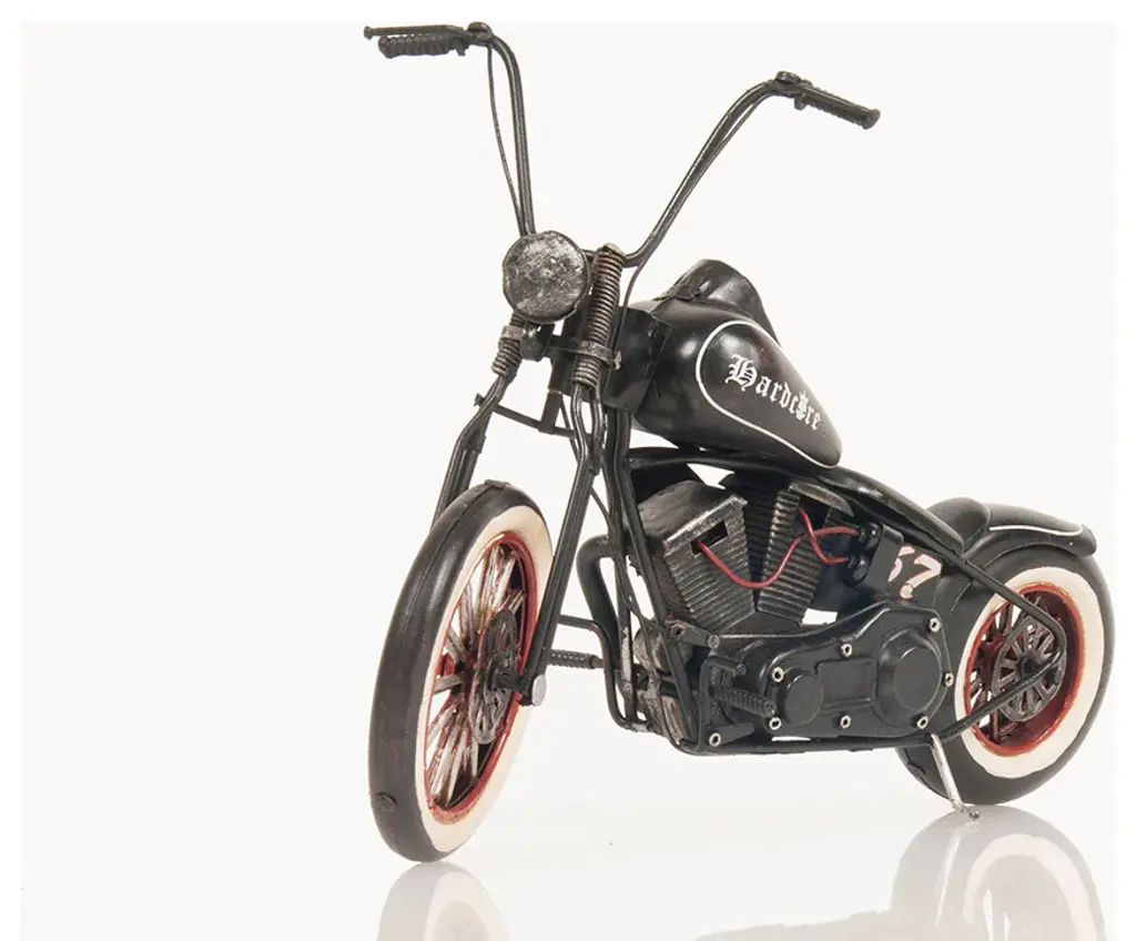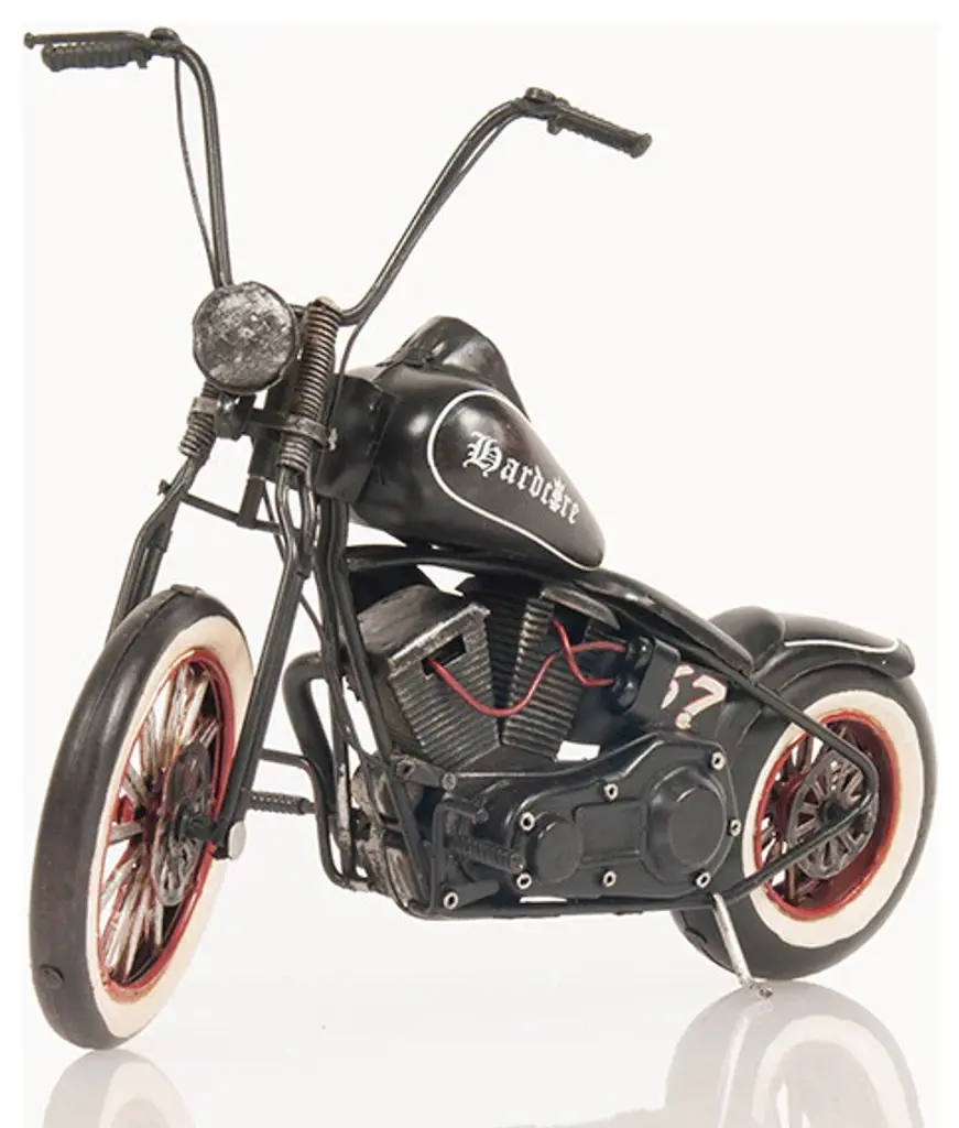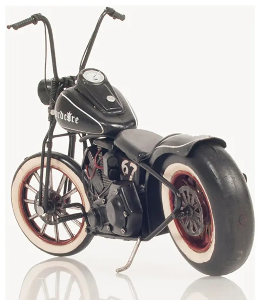 A chopper is a type of custom motorcycle that emerged in California in the late 1950s. The chopper is perhaps the most extreme of all custom styles, often using radically modified steering angles and lengthened forks for a stretched-out appearance. Our Hardcore 67 Chopper Motorcycle model is distinctively handmade out of tin and painted in black. It features many intricate details such as spoke wheels, handlebars, frame, engine, headlights, fuel tank, seat, rear fender, pedals, and much more. This model will make a perfect gift for any biker or rider enthusiasts!