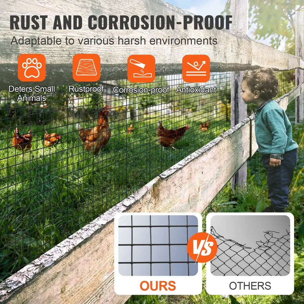 Built to Last: Crafted with professional welding, our hardware cloth features reliable welded joints that eliminate wire breakage. Heavy-duty galvanized steel wire with a double-layer ethylene coating and premium powder coating, ensures rust and corrosion resistance, significantly extending its lifespan. Easy Installation: With a 19 gauge wire diameter (after coating) and a size of 48in x 50ft / 48in x 100ft / 36in x 50ft / 36in x 100ft / 24in x 100ft, / With a 16 gauge wire diameter (after coating) and a size of 36in x 50ft / 24in x 50ft, you have enough material to create wire mesh for various applications. We include gloves and strong pliers for convenient installation and trimming to your desired size. Versatile Applications: Our chicken wire fence roll, is suitable for chicken coop enclosures, poultry pens, rabbit/cat/dog enclosures, backyard snake protection, garden beds, orchard tree protection, soil screens, balcony guards, drainage ditches, furniture decoration, craft projects. Effective Protection: Featuring a 1/2" x 1/2" grid size / (for 36in x 50ft / 24in x 50ft option: 2" x 3"), the wire fence roll provides secure protection for animals and plants. It is waterproof, rustproof, corrosion-resistant, tear-resistant, and has a smooth, attractive surface, maintaining its integrity even in saline environments. Enhanced Packaging: We add an extra layer of paper and plastic film to the exterior of the welded wire fencing, and the packaging box is reinforced and thickened, ensuring your goods arrive in perfect condition. Package Content 1 x Hardware Cloth 1 x Gloves 1 x Powerful Plier
