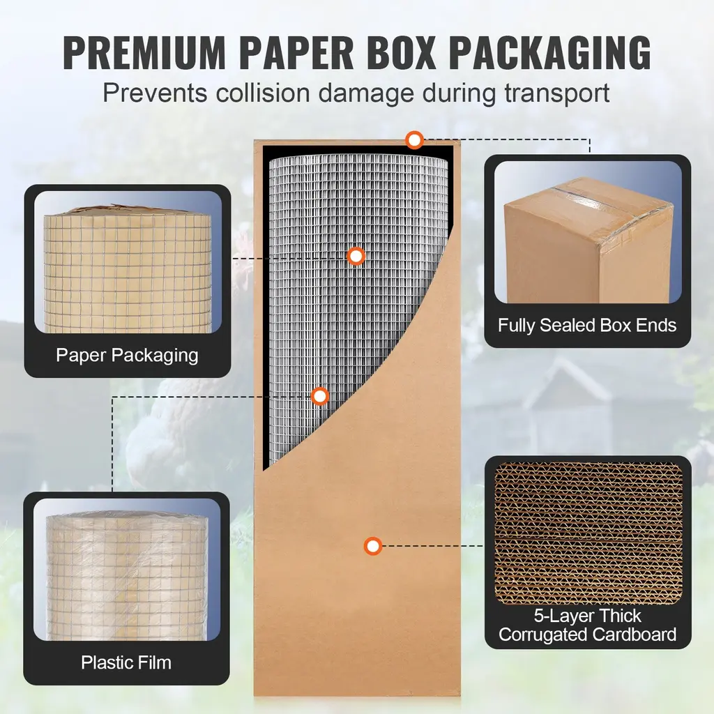 Heavy-Duty Hot-Dipped Galvanization: Our low-carbon steel hardware cloth undergoes professional hot-dipped galvanization for a uniform coating without bubbles. Pre-tested for salt spray, it ensures durable corrosion resistance, lasting through years of outdoor use without needing replacements. Robust Welded Structure: Our hardware cloth is welded from low-carbon steel wire into a sturdy mesh structure, followed by a post-weld galvanization process. Each weld point is zinc-coated to prevent detachment, ensuring a bright, rust-proof finish even after prolonged exposure to different weather conditions. 1/4-inch / 1/2-inch Fine Mesh: Featuring narrow 1/4" / 1/2" mesh, even small animals find it difficult to penetrate. Perfect for safeguarding vegetable gardens from small rodents like squirrels, rabbits, raccoons, skunks, foxes, snakes, and more. Enhanced Packaging: To prevent damage during transportation, Our hardware cloth is packaged in five layers of reinforced cardboard boxes with fully covered sealing at both ends. Internally, it's wrapped with plastic film and paper, ensuring waterproof and rustproof protection. Minimize the risk of damage and ensure safe delivery! Easy to Cut and Use: Simply cut with scissors or wire cutters to create different shapes and sizes for chicken coops, garden beds, rabbit fences, hedges, drainage grid fences, flower beds, DIY projects, and more. Caution: Beware of sharp edges after cutting; always wear gloves when handling. Package Content 1 x Roll of Hardware Cloth