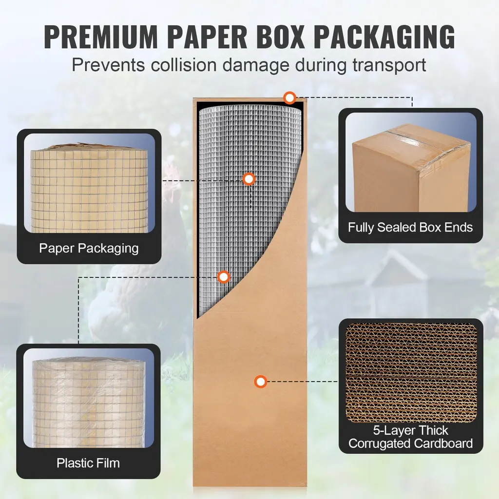 Heavy-Duty Hot-Dipped Galvanization: Our low-carbon steel hardware cloth undergoes professional hot-dipped galvanization for a uniform coating without bubbles. Pre-tested for salt spray, it ensures durable corrosion resistance, lasting through years of outdoor use without needing replacements. Robust Welded Structure: Our hardware cloth is welded from low-carbon steel wire into a sturdy mesh structure, followed by a post-weld galvanization process. Each weld point is zinc-coated to prevent detachment, ensuring a bright, rust-proof finish even after prolonged exposure to different weather conditions. 1/4-inch / 1/2-inch Fine Mesh: Featuring narrow 1/4" / 1/2" mesh, even small animals find it difficult to penetrate. Perfect for safeguarding vegetable gardens from small rodents like squirrels, rabbits, raccoons, skunks, foxes, snakes, and more. Enhanced Packaging: To prevent damage during transportation, Our hardware cloth is packaged in five layers of reinforced cardboard boxes with fully covered sealing at both ends. Internally, it's wrapped with plastic film and paper, ensuring waterproof and rustproof protection. Minimize the risk of damage and ensure safe delivery! Easy to Cut and Use: Simply cut with scissors or wire cutters to create different shapes and sizes for chicken coops, garden beds, rabbit fences, hedges, drainage grid fences, flower beds, DIY projects, and more. Caution: Beware of sharp edges after cutting; always wear gloves when handling. Package Content 1 x Roll of Hardware Cloth