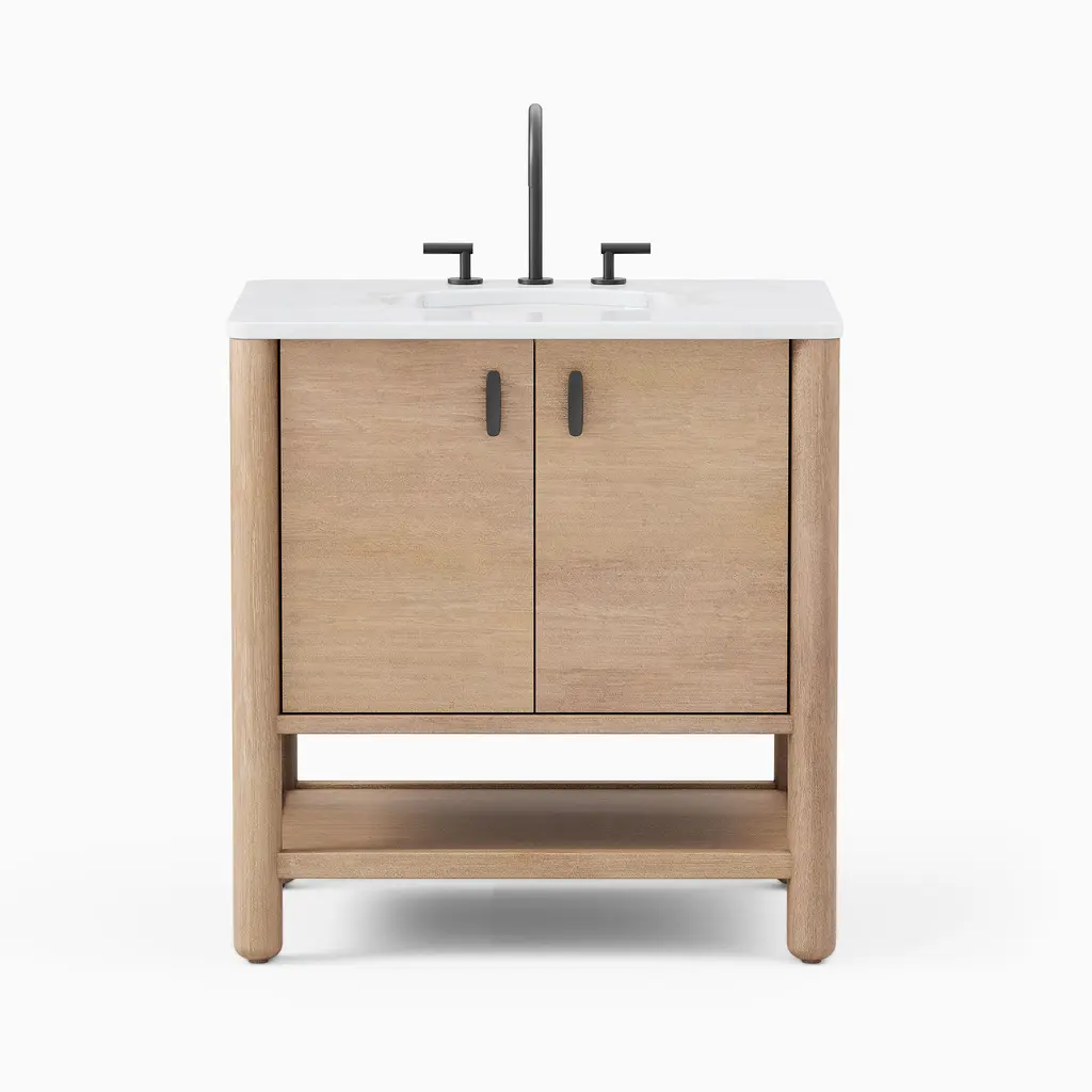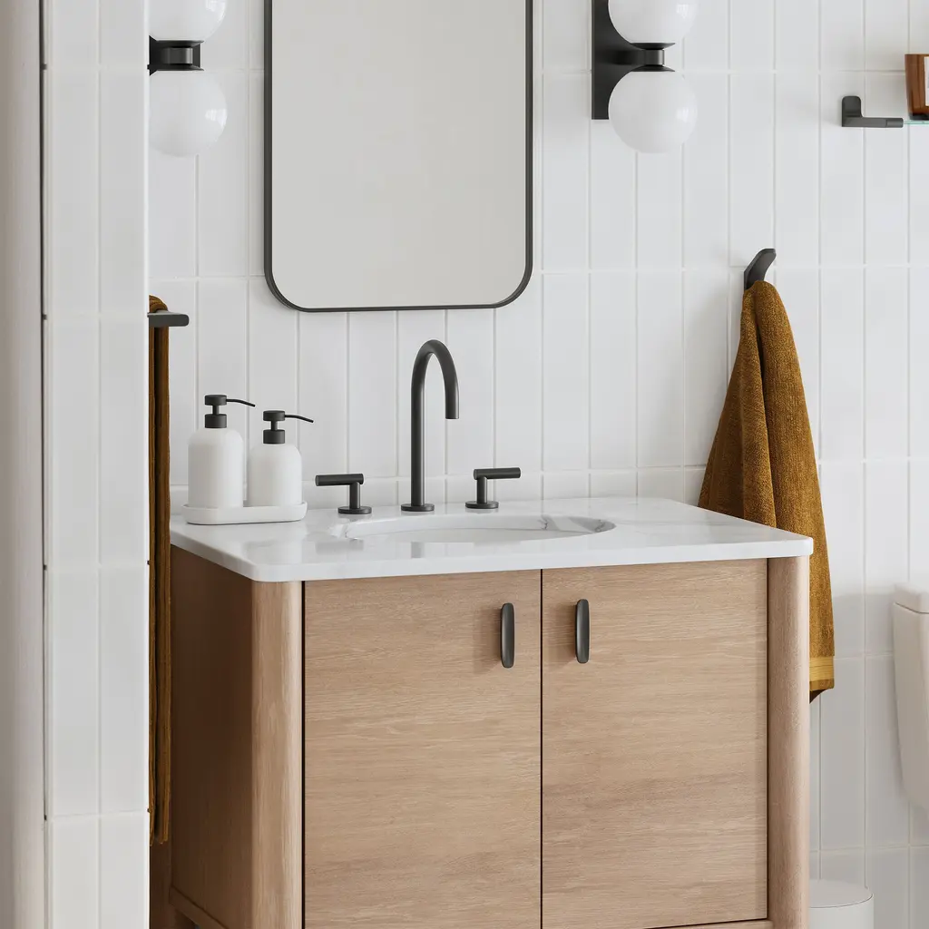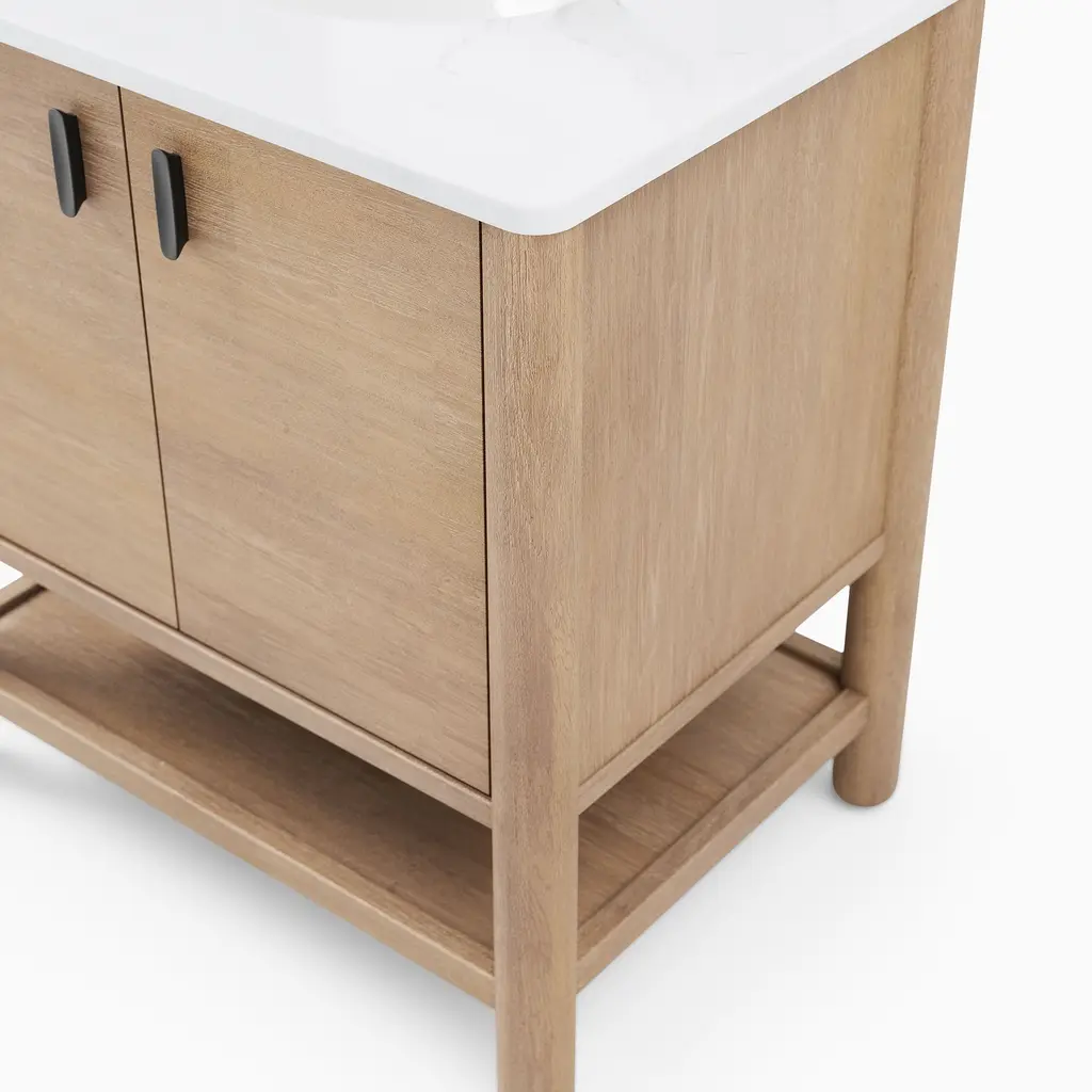 Brings a coastal elegance to your bath. Simple, versatile finish that looks good in any space. Luxe marble tops a cabinet and shelf for storage. Made from kiln-dried, sustainably sourced wood.