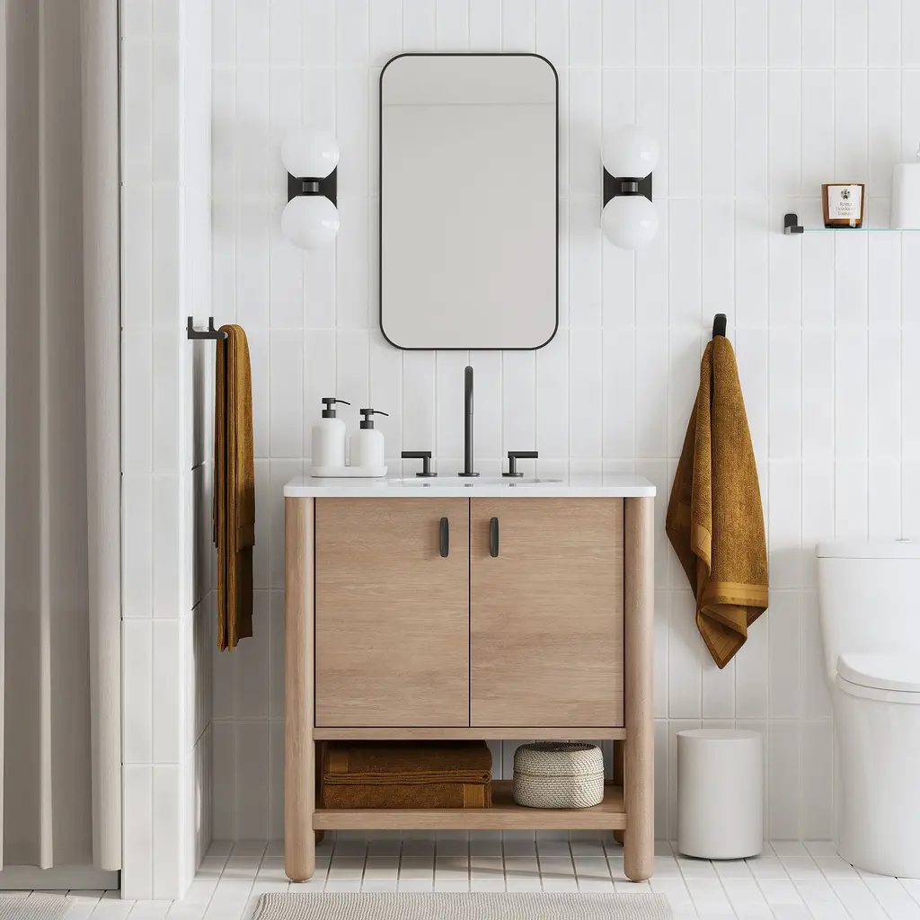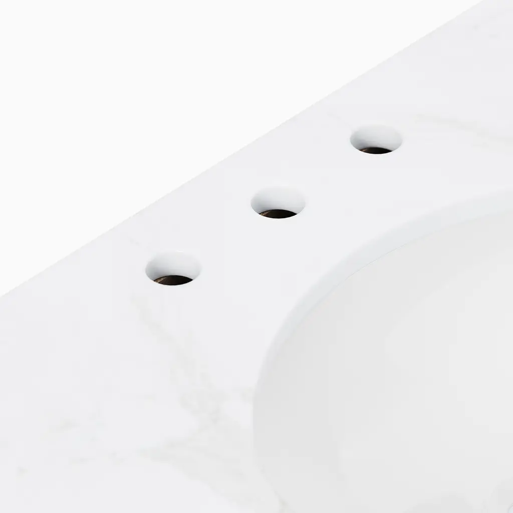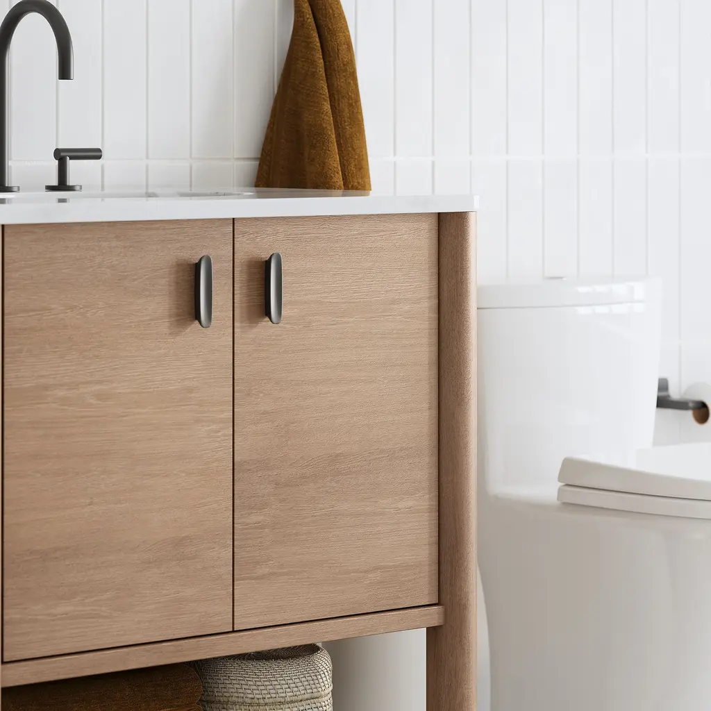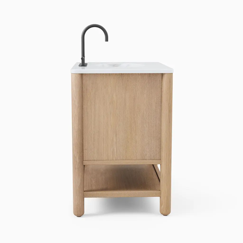Brings a coastal elegance to your bath. Simple, versatile finish that looks good in any space. Luxe marble tops a cabinet and shelf for storage. Made from kiln-dried, sustainably sourced wood.