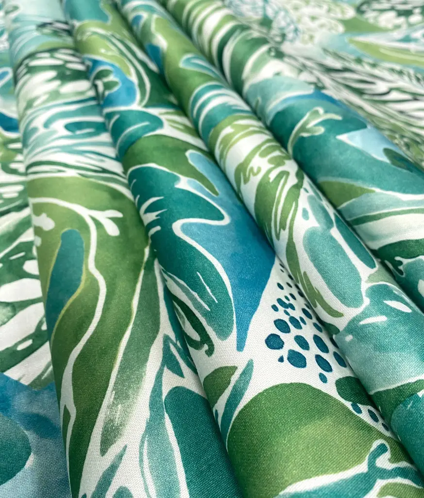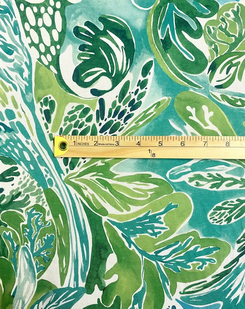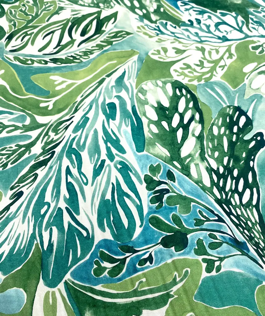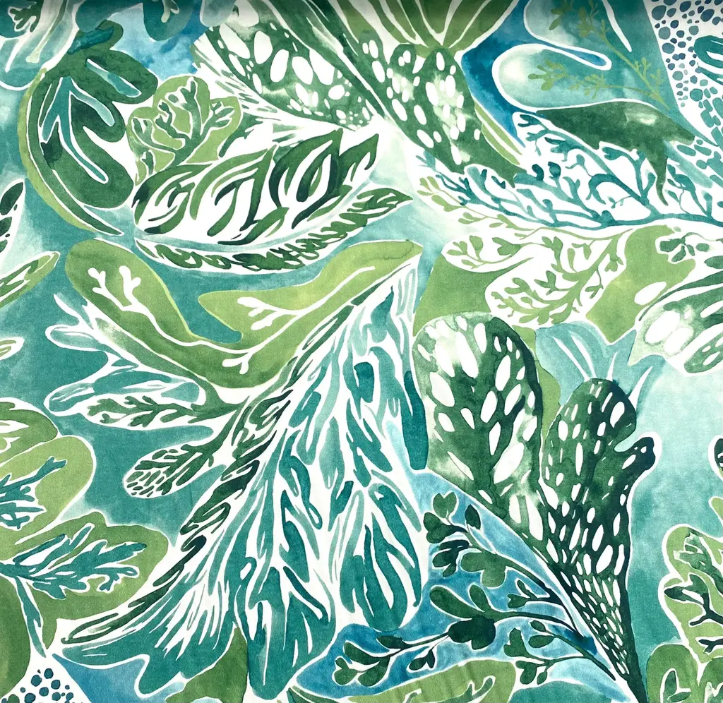 55" wide Harlequin Alotau fig leaf tree canopy botanical floral cotton upholstery drapery fabric in teal, green and white. Price is per yard. Content: 100% Cotton Width: 55" Vertical Repeat: 32.25" Horizontal Repeat: 10.75" Match: Straight Country Of Origin: United Kingdom