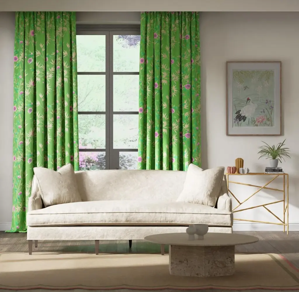 Featuring bamboo stems entwined with delicate anemone blooms this classically inspired design is closely related to its silk original. Reimagined and given a fresh new look Lady Alford is available in four updated colourways and printed on either cotton/linen or cotton/satin. Sharing a broad and far reaching appeal luscious apple green and pops of vibrant pink contrast with the traditional pairing of blue and white. Lady Alford is an excellent choice for drapes. 100% Cotton. Sold by the yard. Part of the HARLEQUIN-DIANE HILL PRINTS Collection. Vertical Repeat: 26.6141732283465 Horizontal Repeat: 27.6377952755906 Aftercare Codes: No Machine Wash - SDC / No Ble / No tumb / C Iron / Iron Rev / SDC (Spec) This item is non-refundable, but swatches are available for purchase. Colors can vary from screen to screen; we recommend ordering a swatch before placing your full size purchase. For any questions, please reach out to swatches@chairish.com