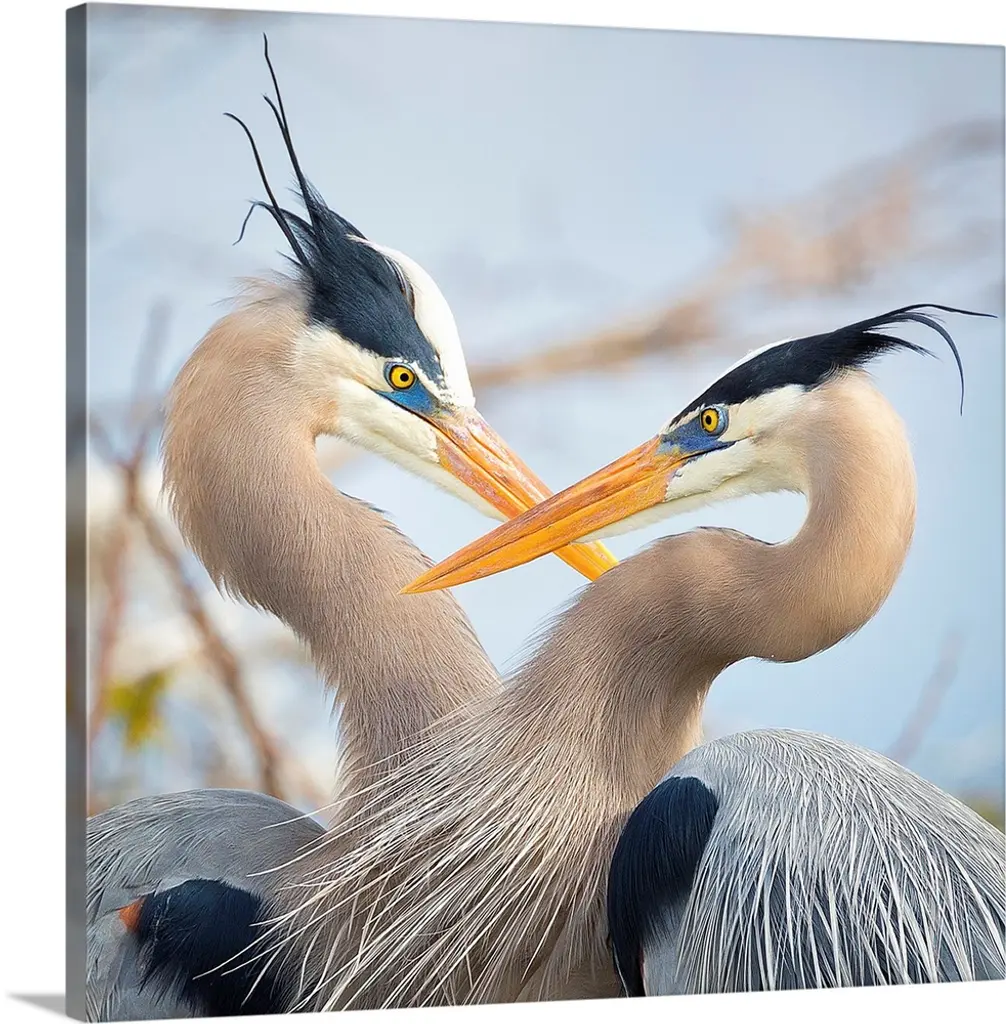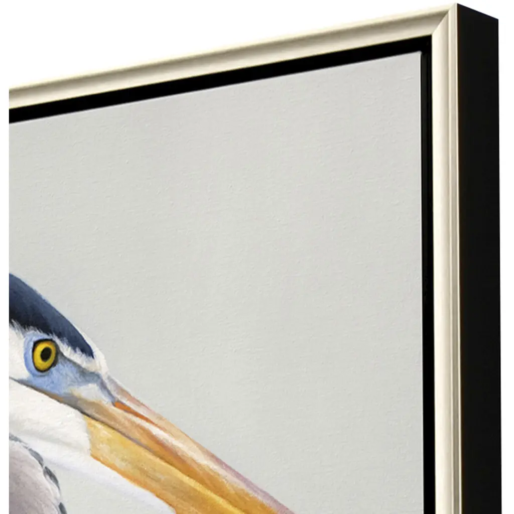 Blue herons stand together in harmony. Canvas is wrapped around wood stretcher bars and mounted in a warm silver floater frame with satin black side.