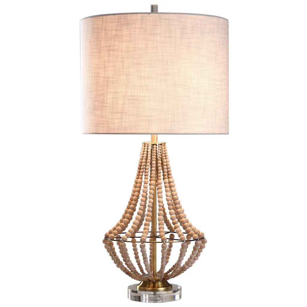 Harp & Finial Aurora Natural Wood Bead Body Table Lamp With Off White Textured Linen Hardback Shade - Natural