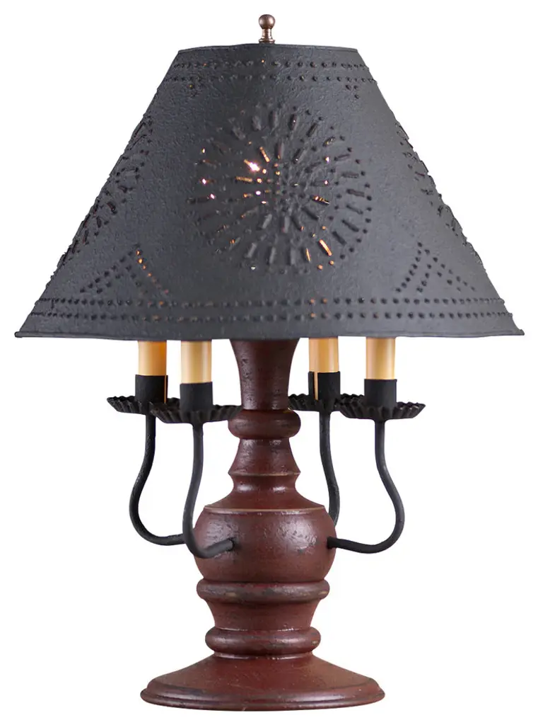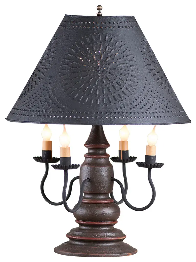 4 candelabra arms, 60 watts max. per socket. Center light has a standard socket, 150 watts max. 3-way switch. Distressed textured paint on the body and textured black paint on the arms and shade.Bulbs Not Included