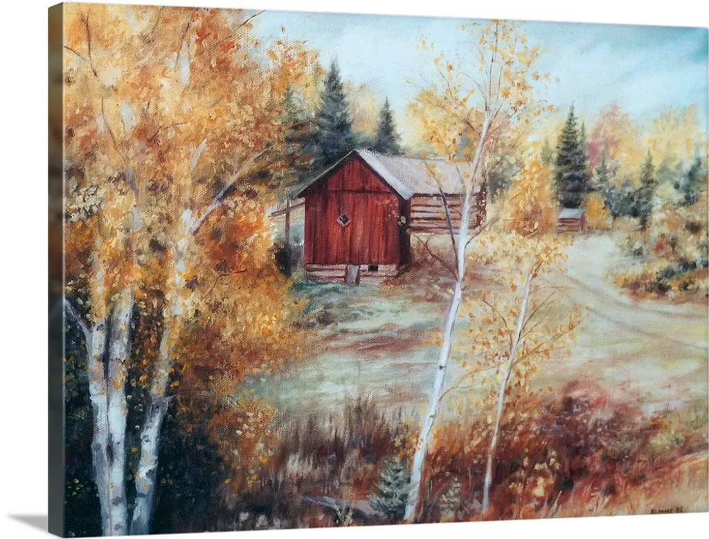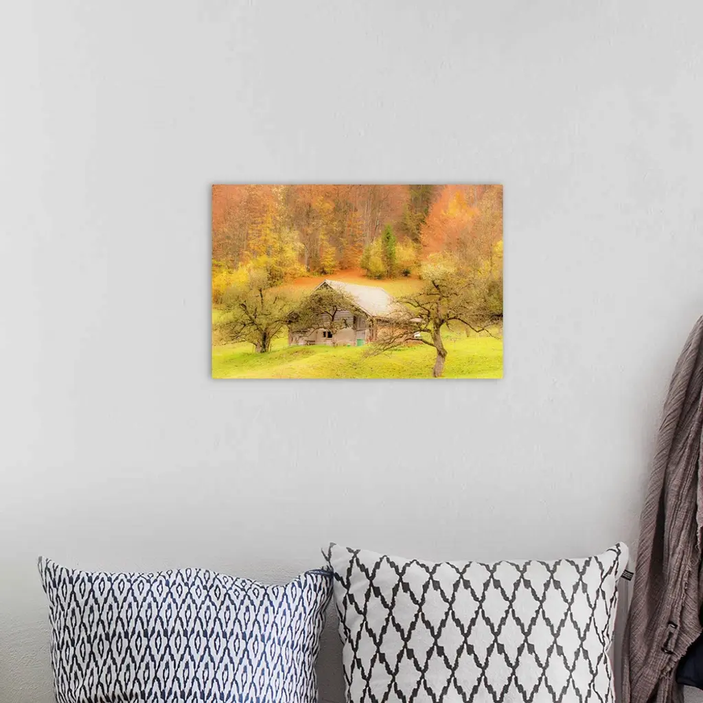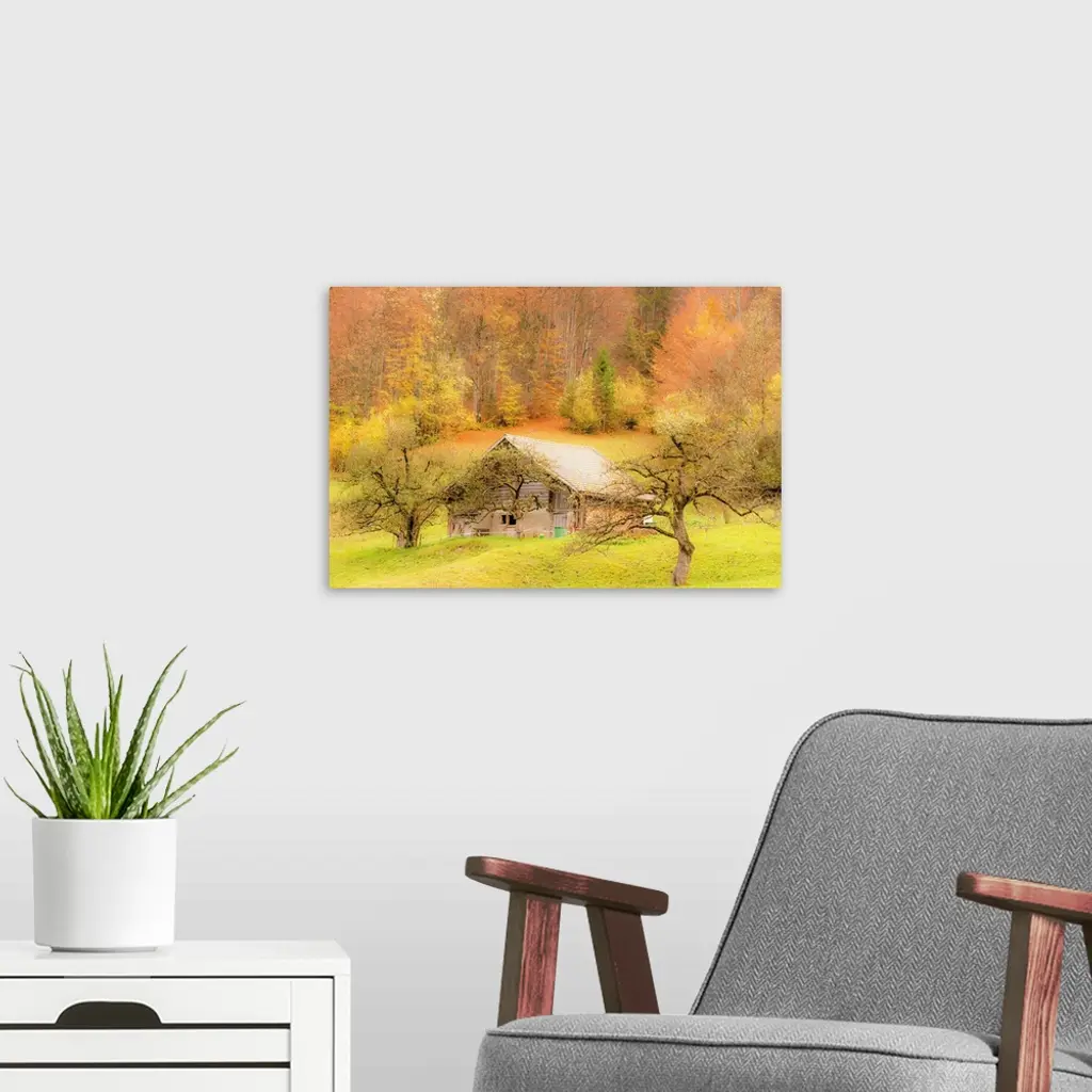 Landscape photograph of an old barn on a hill surrounded by Autumn trees.