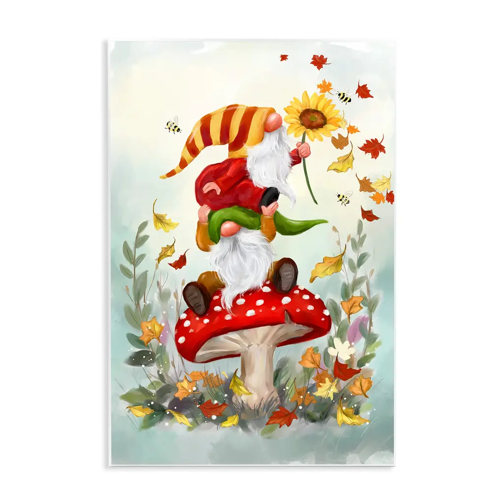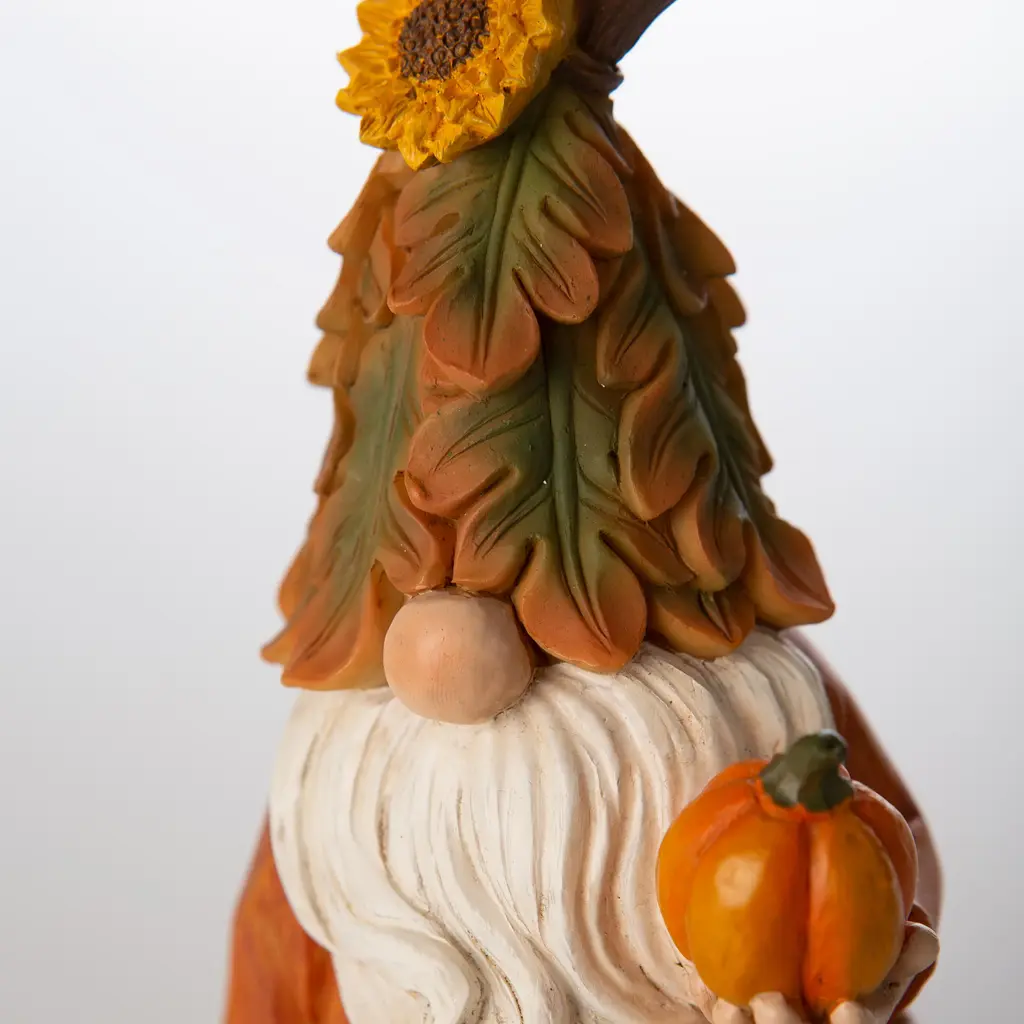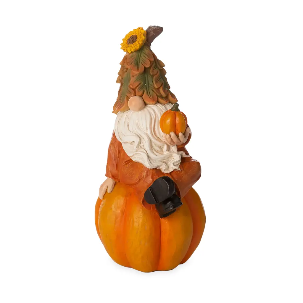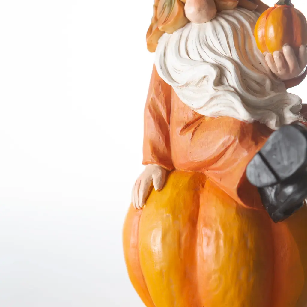 This forest gnome is ready for the season of harvest. He sits stoutly on a pumpkin with his legs jauntily crossed and holds a smaller pumpkin out, as if he is offering you part of his harvest.The delightful details continue with the gnome's flowing, white beard and upside-down leaves hat, which covers his eyes and leaves his large but adorable nose in view.You will love having this harvest helper sitting on a table, shelf, or on a covered porch. Once you display him for the fall season you won't want to put him away!Indoor or covered porch use only. Made of resin.