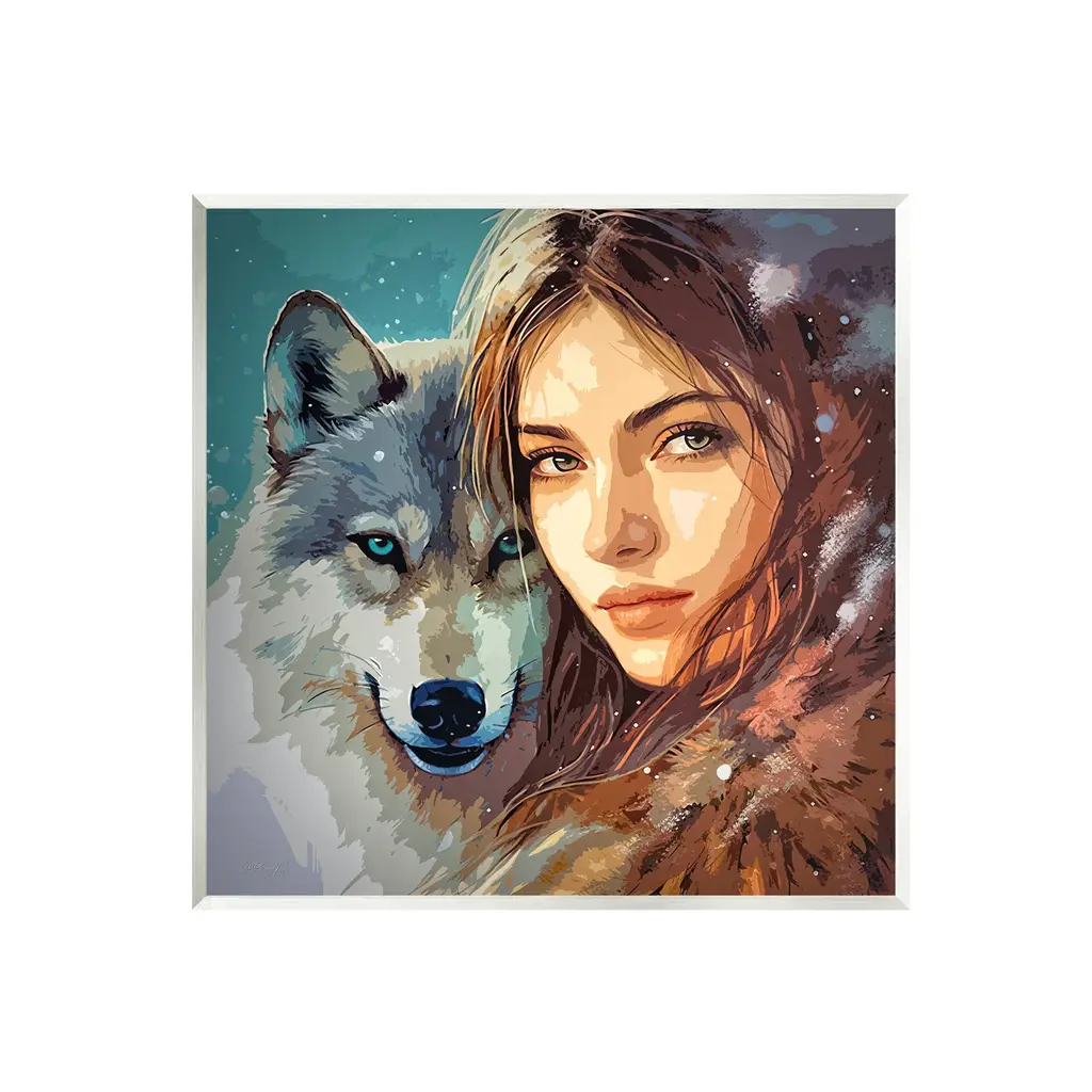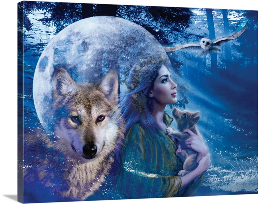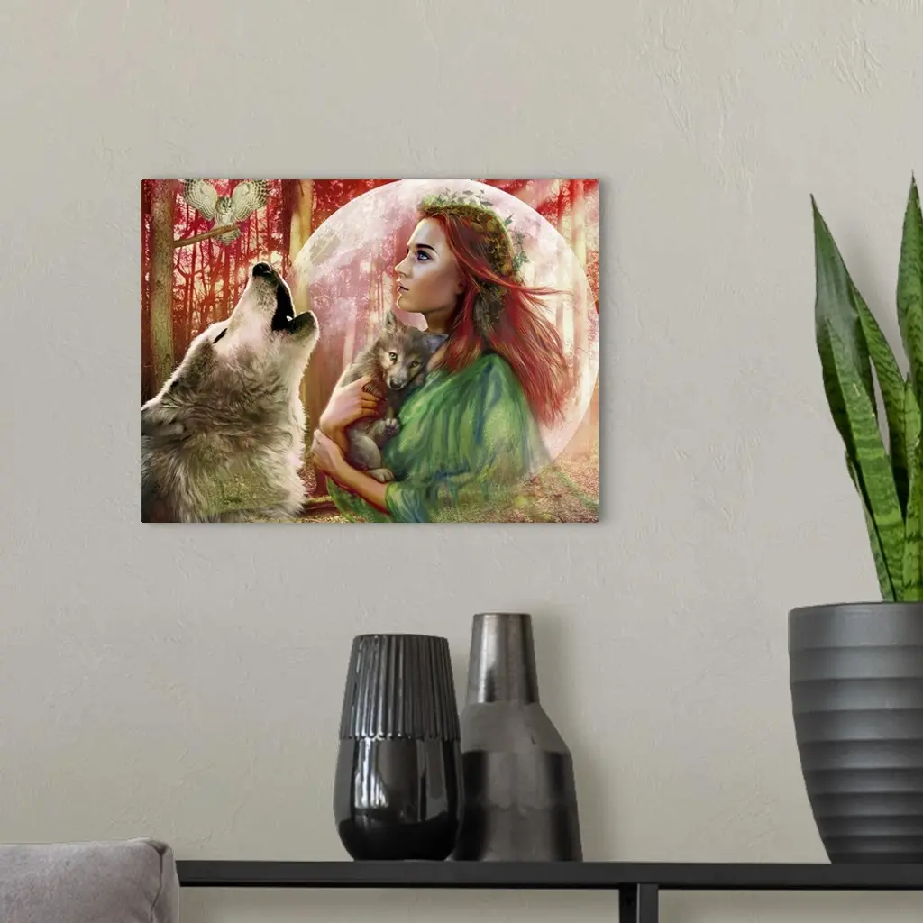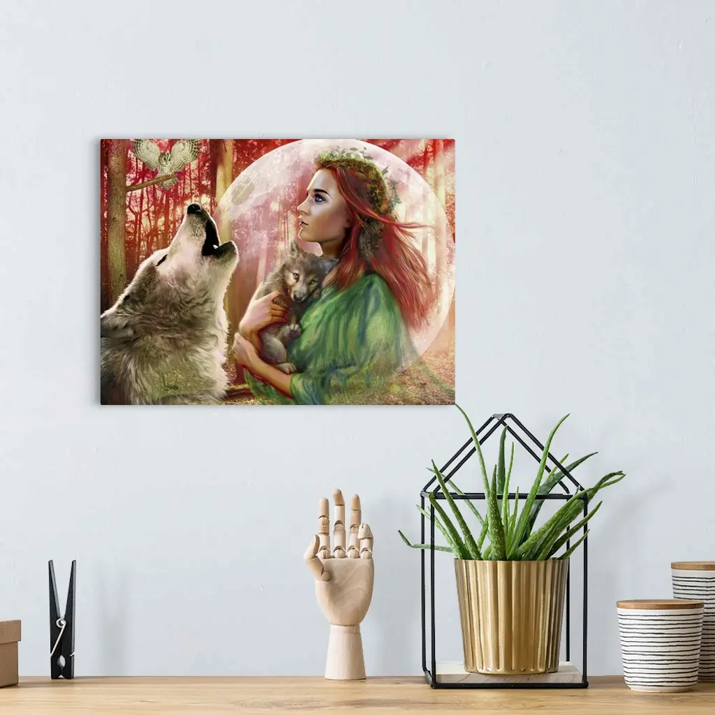Fantasy art work of a red haired woman with ivy in her hair in a forest holding a wolf cub as an owl takes flight from a tree and a full grown wolf howls at the moon.