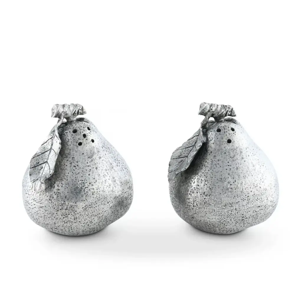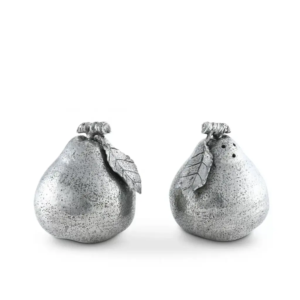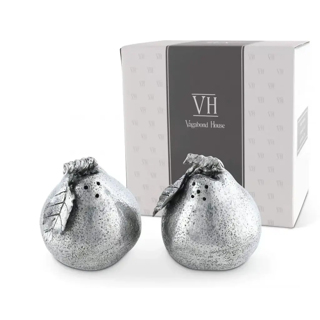 Fruit is both decorative and functional with Vagabond House's Pear Salt and Pepper Set. Crafted in luxury-grade pewter, the life-size pears show lifelike detail in their spotty flesh and rounded bottoms. Each piece's stem attaches to a figural branch, which also supports a single, veiny leaf. Vagabond House is a family-owned American company specializing in fine pewter tableware, servingware and giftware. Largely inspired by nature, their exclusive products are designed to be unique, functional heirlooms for those who seek to express tradition and style in both family and formal entertaining.