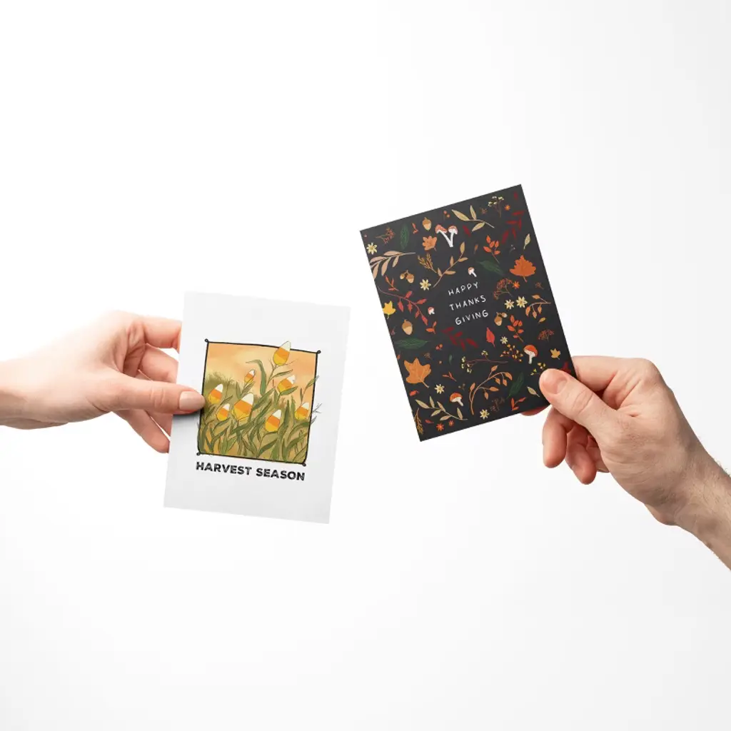 This 3-pack of assorted Fall/Autumn/Thanksgiving greeting cards is elegantly illustrated by artist Ingrid Ramus, founder and owner of the Ramus & Co brand. The cards are blank inside. All greeting cards are made in the USA on heavyweight uncoated and locally-manufactured card stock. Each card is individually wrapped in TUV Austria certified-compostable PLA sleeves that meet both ASTM D6400 & EN 13432 standards. Each card is accompanied by a hand-embossed envelope made with heavyweight 95lb paper and a peel-and-stick flap - no licking envelopes here! All Ramus & Co. greeting cards are printed on FSC¬¨¬ and SFI¬¨¬ certified paper sourced from a regional mill that harnesses 66% of its energy from on-site sustainable sources, such as emission-free hydroelectricity and biomass co-generation from wood waste. Additionally, our greeting cards are thoughtfully packaged in bags made from certified compostable PLA material. Husband-and-wife team Calvin and Ingrid Ramus founded Ramus & Company in 2019, in New England, USA. Ingrid, the creative designer behind the brand, originates from Mexico, where she cultivated her skills in fashion and textile design. Drawing from her unique and inquisitive perspective on preppy style, Ingrid prolifically designs whimsical yet classic stationery and lifestyle items.