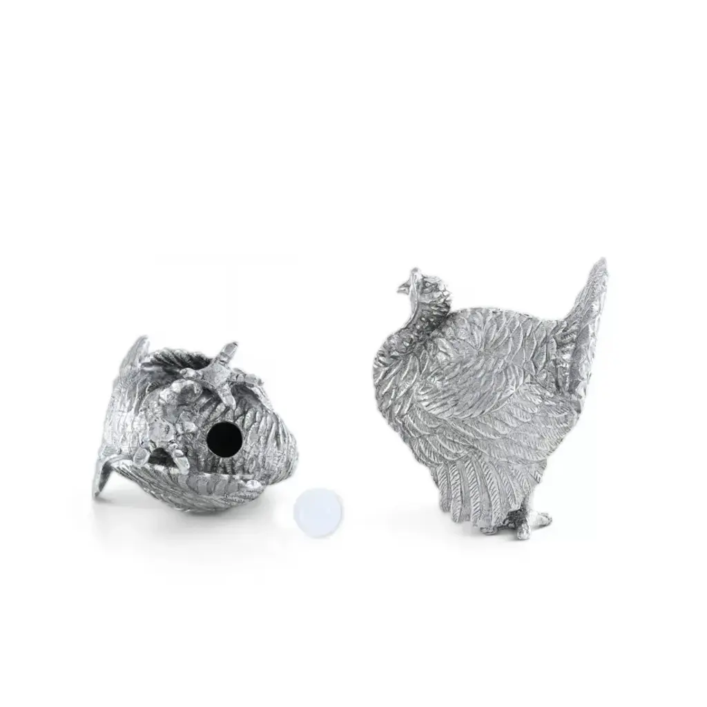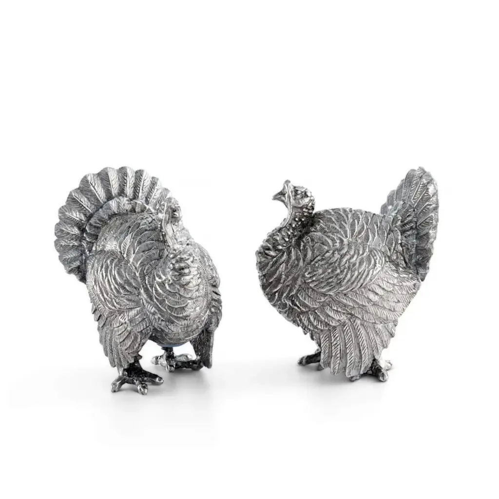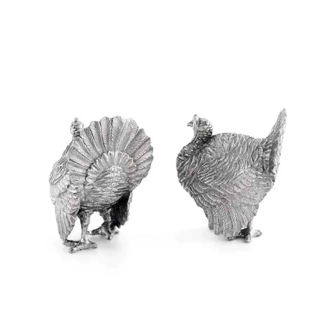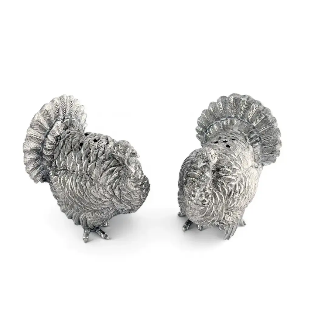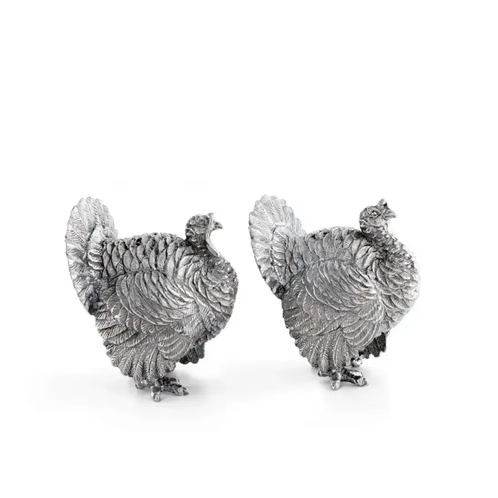 Brilliantly defined in our luxury pewter, two turkeys exhibit tremendous detail in their layered wings and ornamental tail feathers. Realistic claws, faces and wattles only add to the festive appeal of this set. Put the finishing touch on your autumn-themed table with Vagabond House's Turkey Salt and Pepper Set. Vagabond House is a family-owned American company specializing in fine pewter tableware, servingware and giftware. Largely inspired by nature, their exclusive products are designed to be unique, functional heirlooms for those who seek to express tradition and style in both family and formal entertaining.