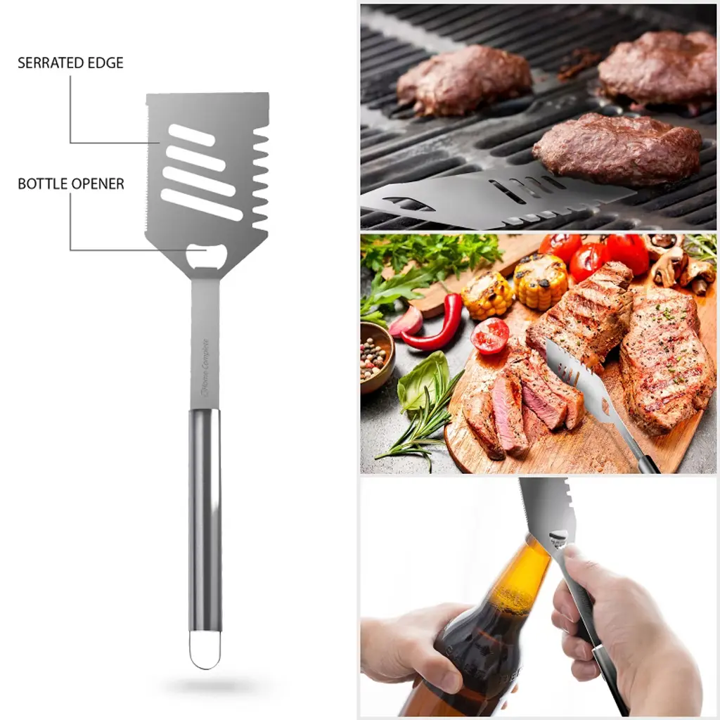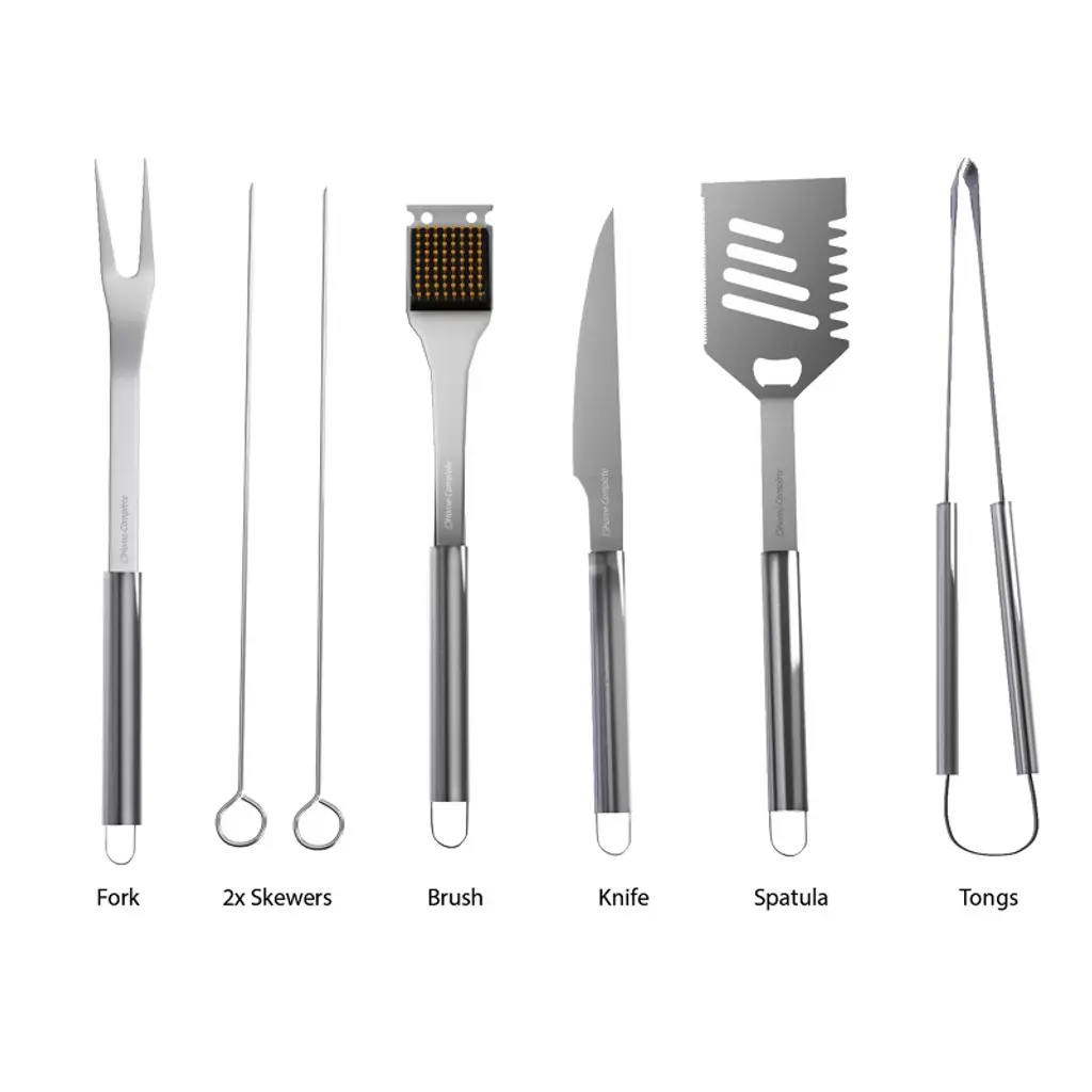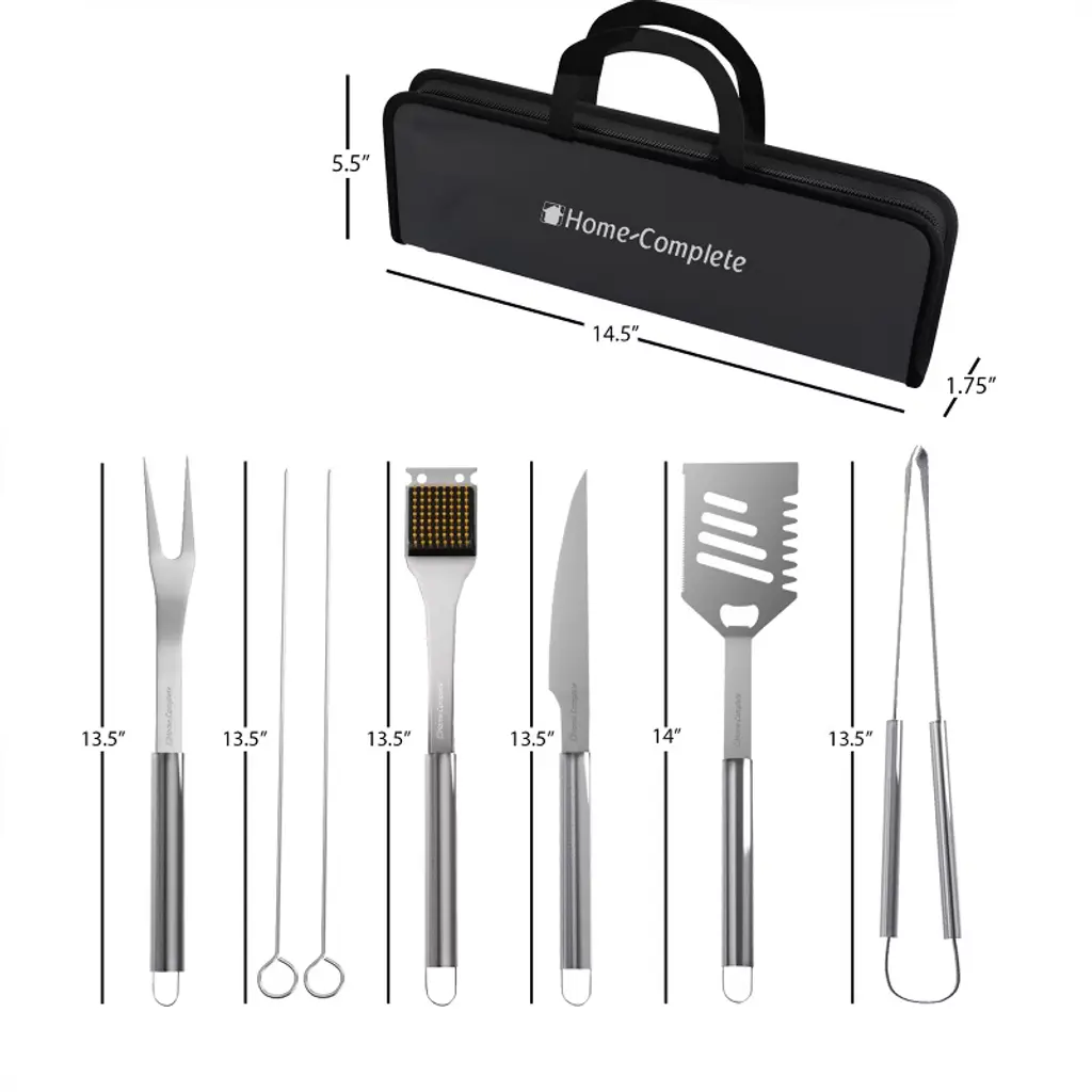Take total control of your grill with the seven utensils included in this BBQ Grill Tool Kit from Hastings Home. With a spatula and tongs for handling patties, a fork and knife for cutting meats, two skewers for shish kebabs, and a convenient brush for keeping your grill tidy, this set has all the essentials for a backyard cookout or beach picnic. A built-in bottle opener on the spatula provides even more functionality. All seven utensils in this BBQ tool set are made from rust-resistant stainless steel for reliable durability. An included storage case makes it easy to keep all these grill and griddle accessories within reach of your food preparation area.