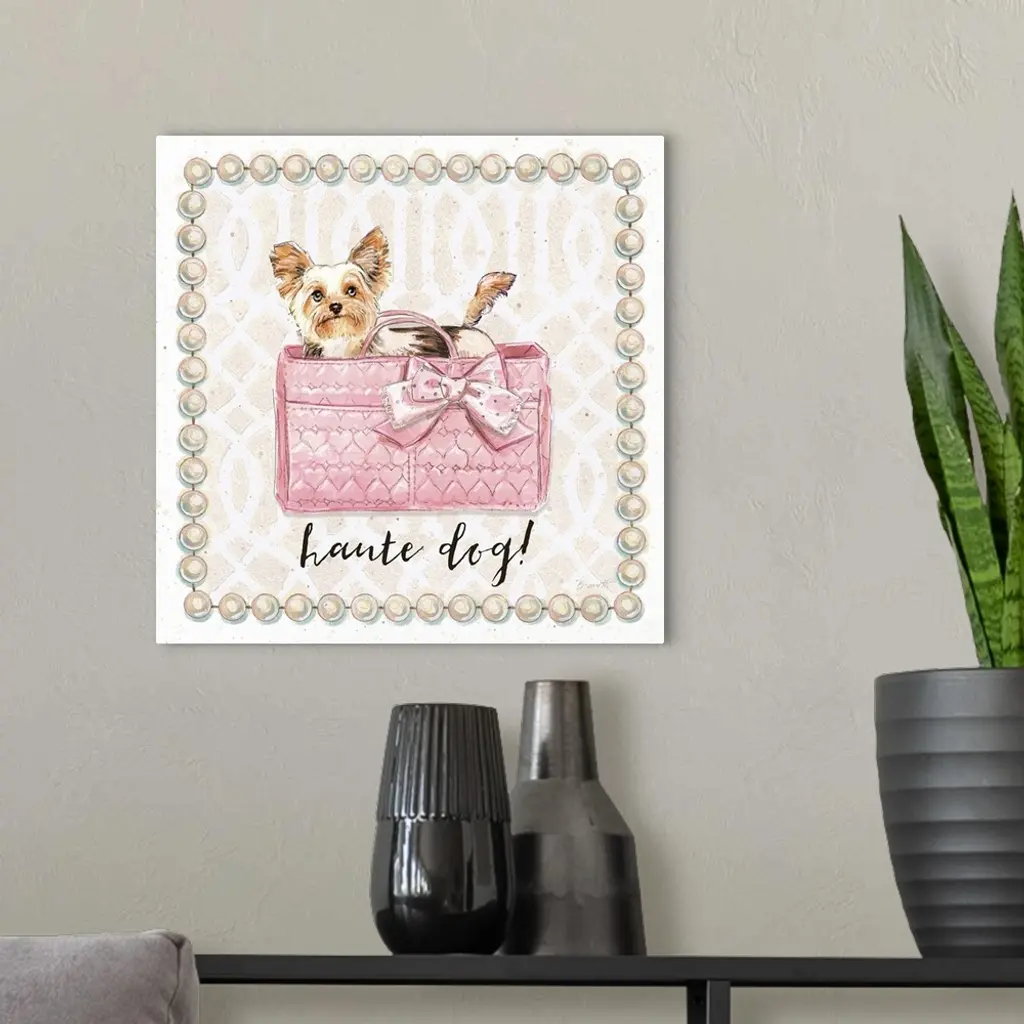 Illustration of a cute yorkshire terrier puppy in a fashionable handbag.