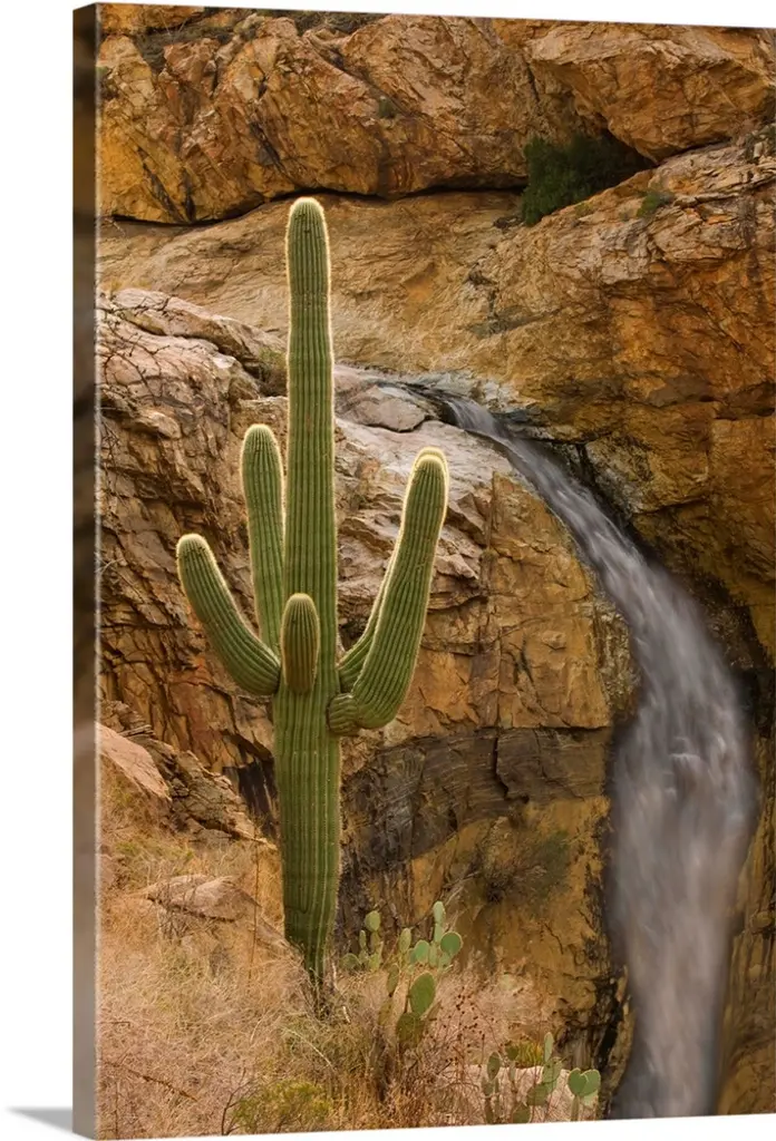Large photograph showcases water falling down a jagged cliff and splashing into the pool below before moving on down a rocky stream within the Southwestern United States.