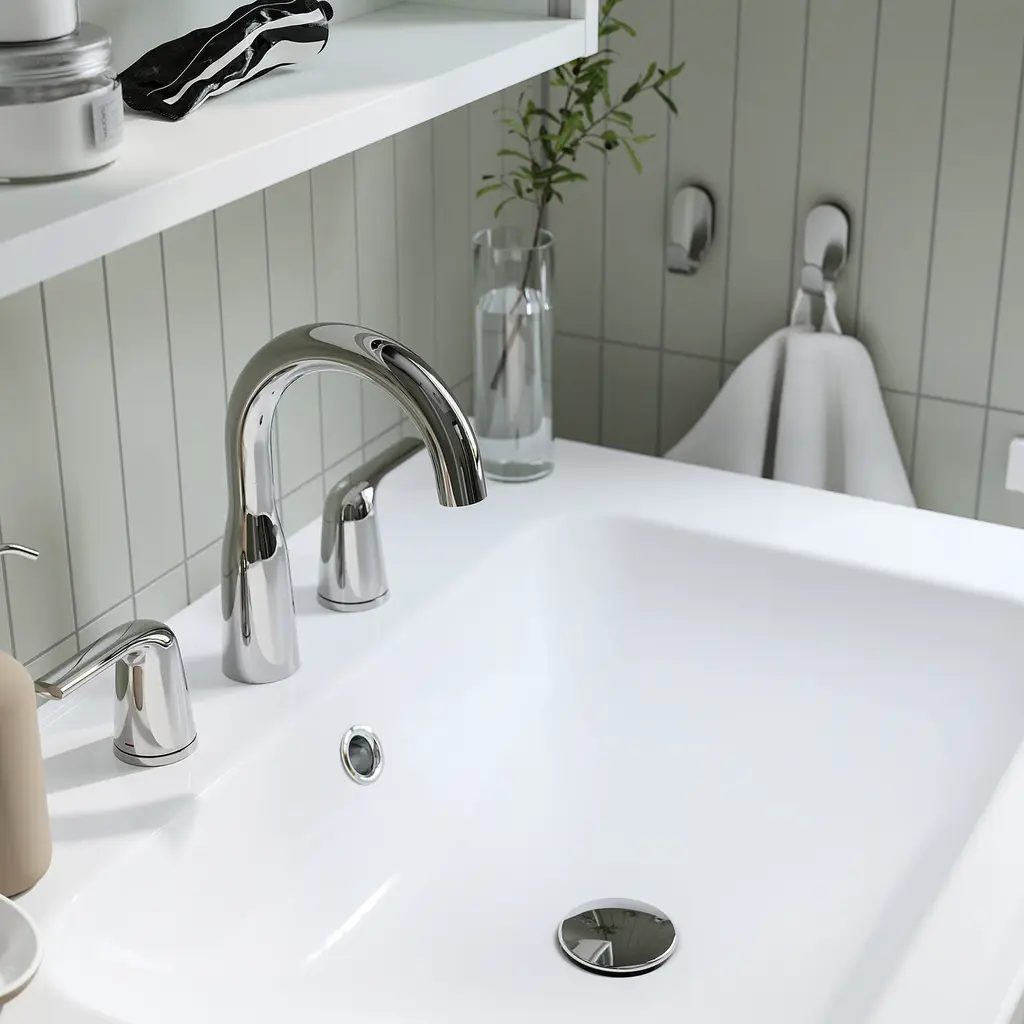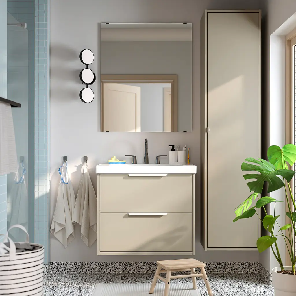 HAVBÄCK / ORRSJÖN Bathroom vanity with sink & faucet - beige 31x21 3/4x27 5/8 ". The matt beige finish serves as the perfect base for creating a relaxing bathroom retreat. It has a clean and straightforward expression that is easy to personalize with your choice of knobs or handles.