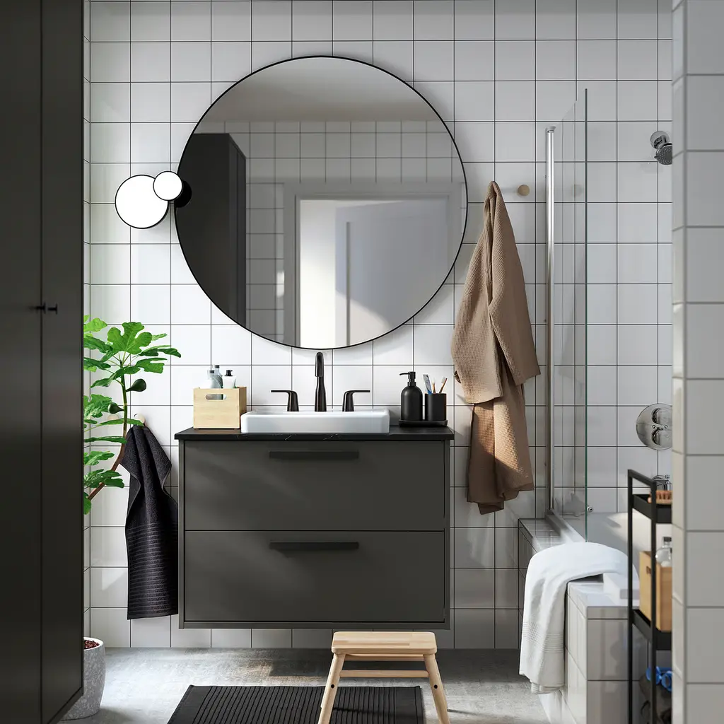 HAVBÄCK / ORRSJÖN Bathroom vanity with sink & faucet - dark gray/black marble effect 37x21 1/2x28 3/8 ". Uncomplicated design matched with a matt dark grey finish gives your bathroom a confident expression and a warm sense of calm that is easy to personalize with your choice of knobs or handles.