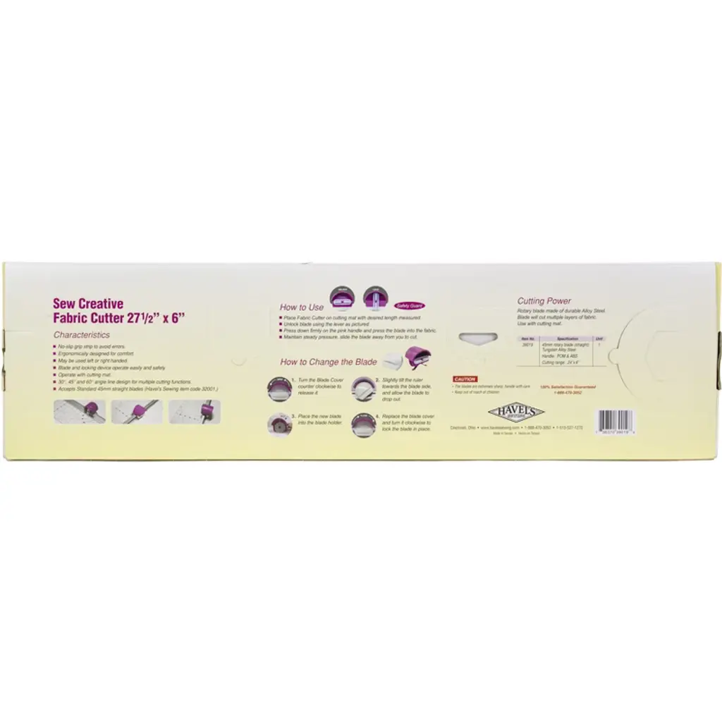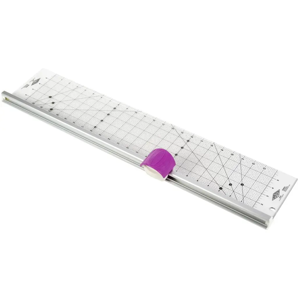 Avoid slips in your strips! Fabric Cutter is perfect for cutting an entire width of fabric bolt with precise lines every time. The attached ruler has a no-slip grip strip for better control. The blade will lock in place for safety and is easy to change. This item is ideal for strip piecing. There is a 30, 45, and 60 degree angle line design for multiple cutting functions. This package contains one 27.5x6 inch fabric cutter, one six inch wide ruler, and one 45 millimeter blade. The fabric cutter operates with a cutting mat. Accepts standard 45 millimeter straight blades. Imported.