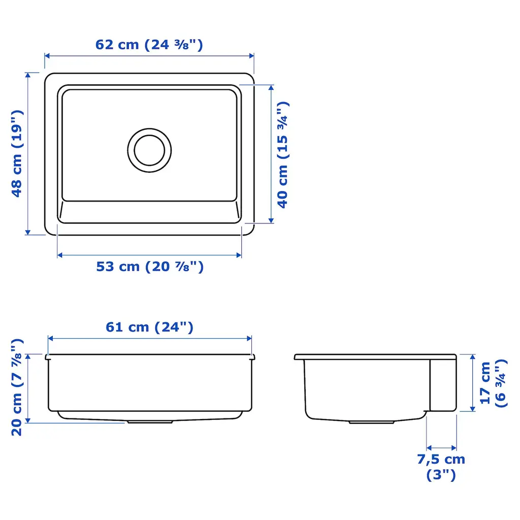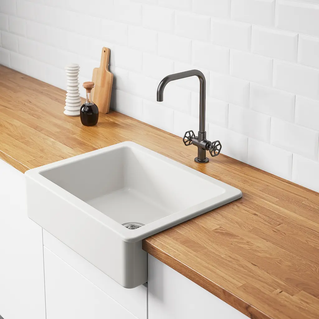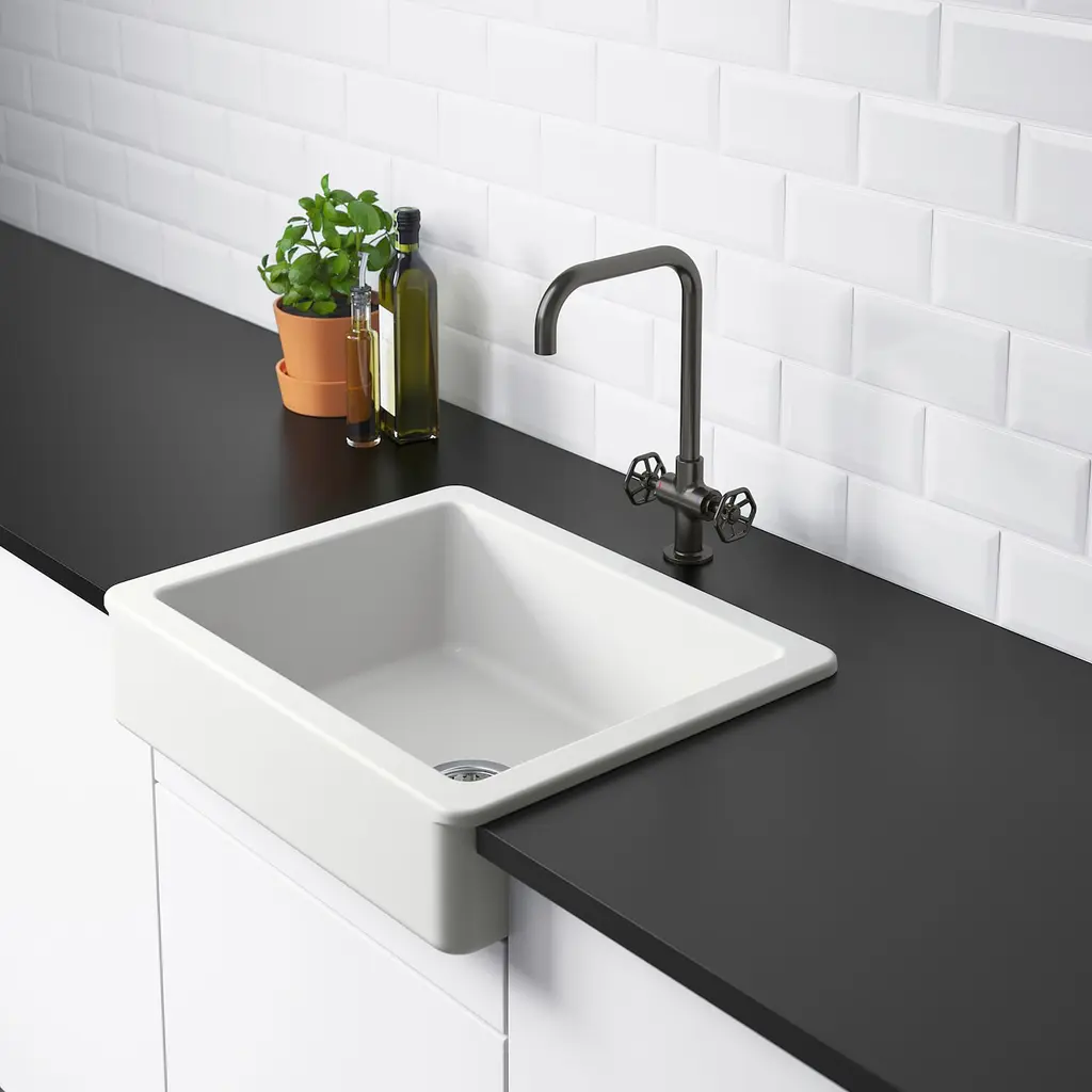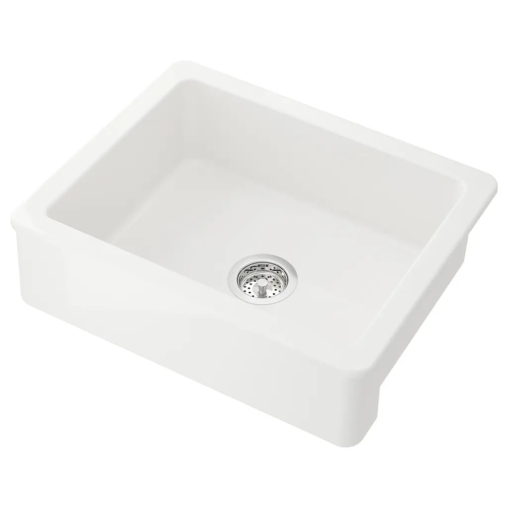 HAVSEN Apron front sink - white 25x19 ". 25-year Limited Warranty. Read about the terms in the Limited Warranty brochure. The sink does not reach all the way to the back of the worktop, which allows you to install a kitchen mixer tap and add other sink accessories as you like.
