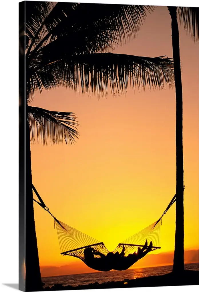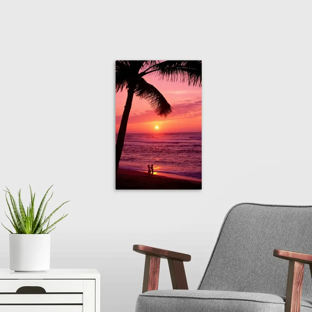 Hawaii, Couple Silhouetted On The Beach At Sunset With Tall Palm Foreground wall art for home and office decor. Discover canvas art prints, photos, mural, big canvas art and framed wall art in GreatBigCanvas.com's varied collections.