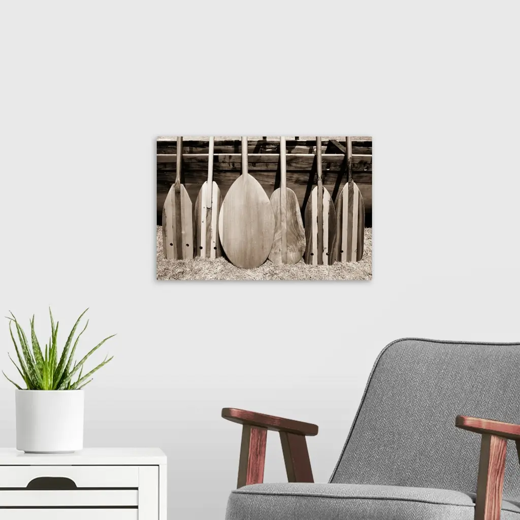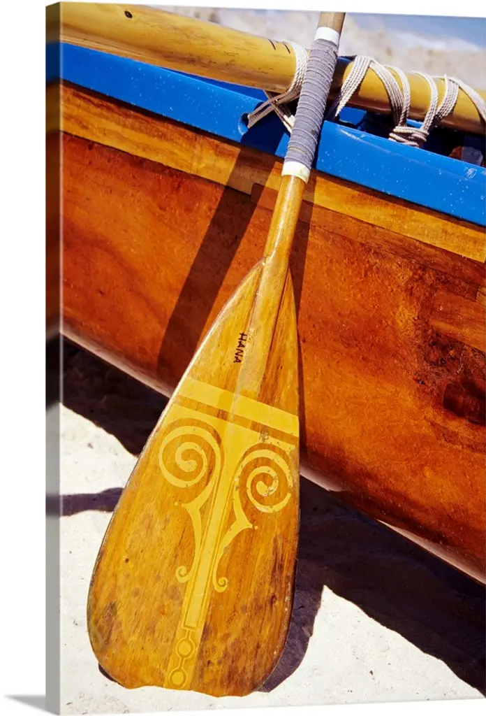 Hawaii, Different Shaped Canoe Paddles In Front Of Koa Canoe wall art for home and office decor. Discover canvas art prints, photos, mural, big canvas art and framed wall art in GreatBigCanvas.com's varied collections.