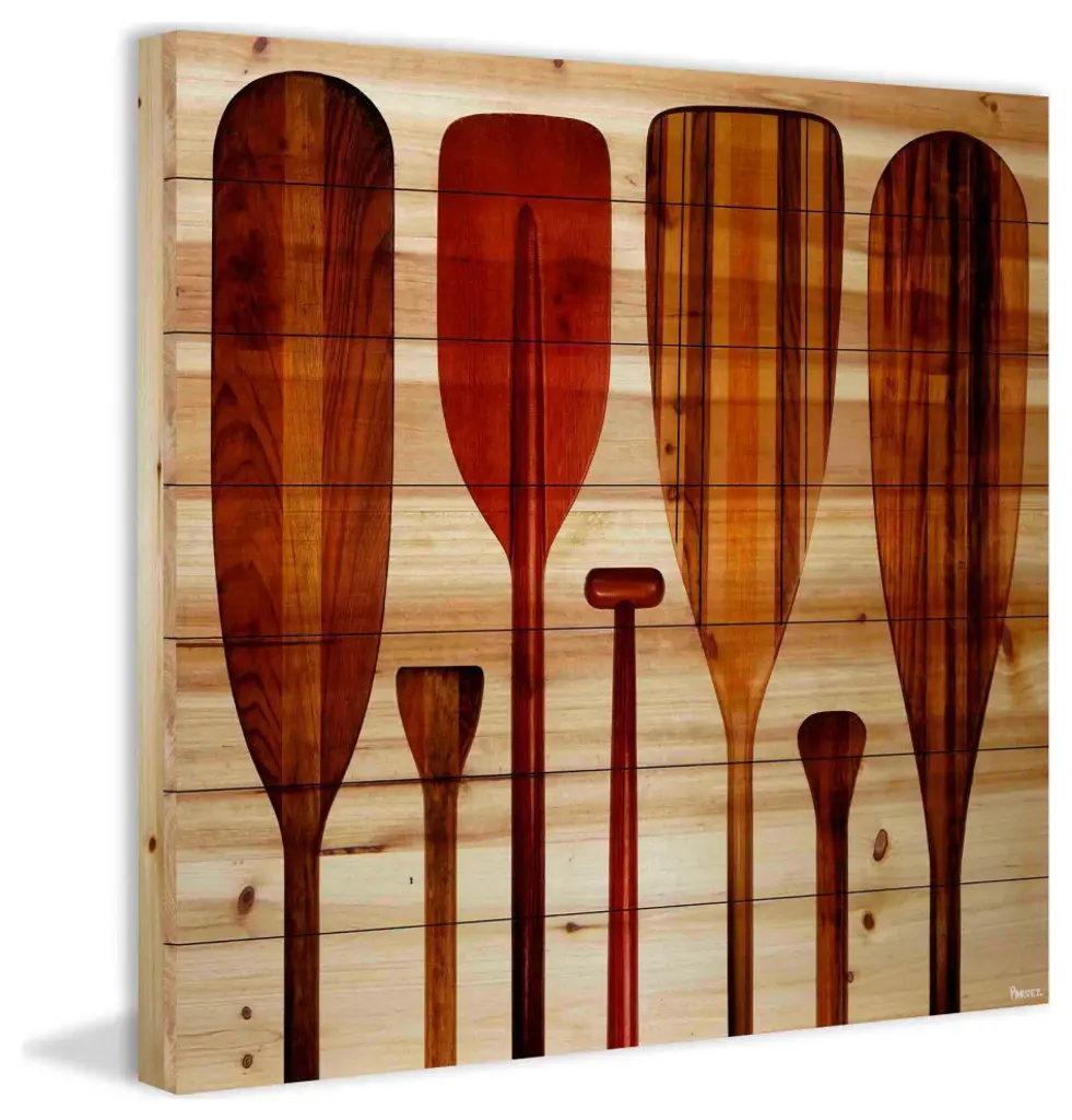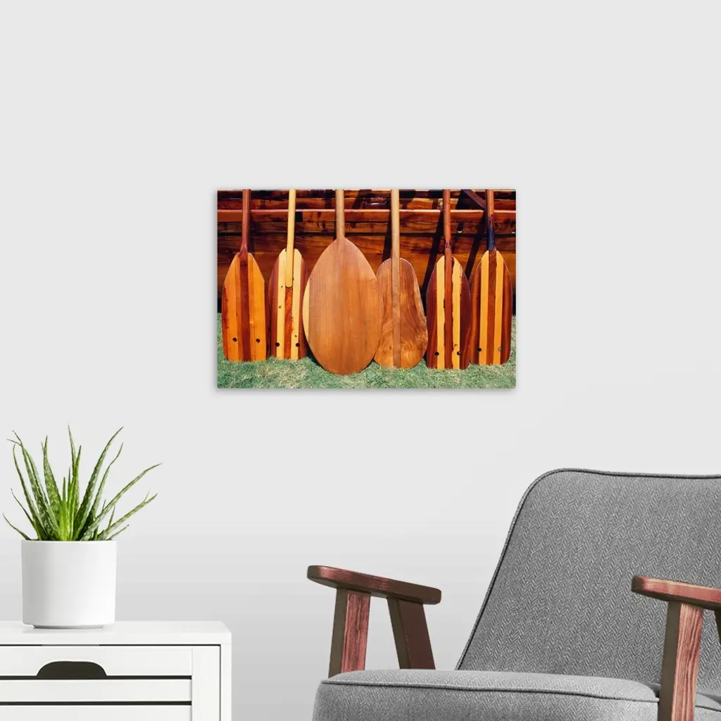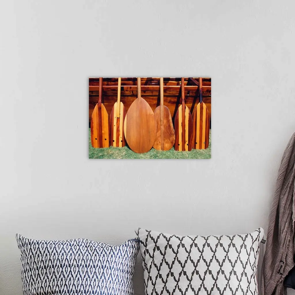Hawaii, Different Shaped Canoe Paddles In Front Of Koa Canoe wall art for home and office decor. Discover canvas art prints, photos, mural, big canvas art and framed wall art in GreatBigCanvas.com's varied collections.
