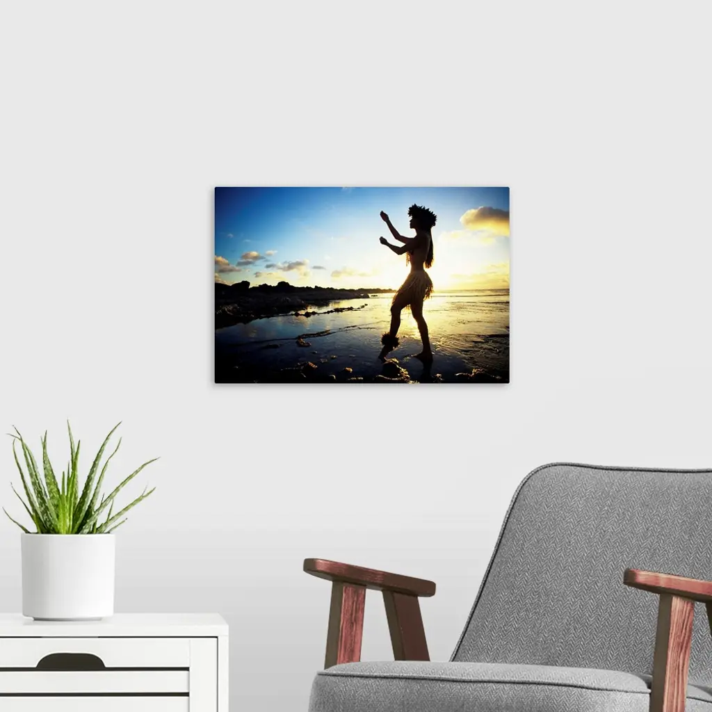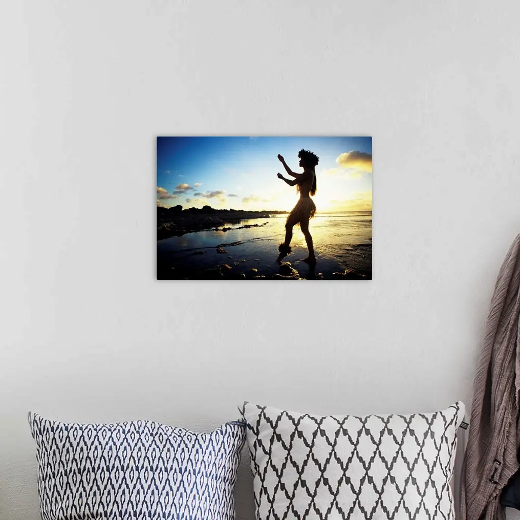 Hawaii, Female Hula Dancer On Beach, Silhouetted By Sunset wall art for home and office decor. Discover canvas art prints, photos, mural, big canvas art and framed wall art in GreatBigCanvas.com's varied collections.