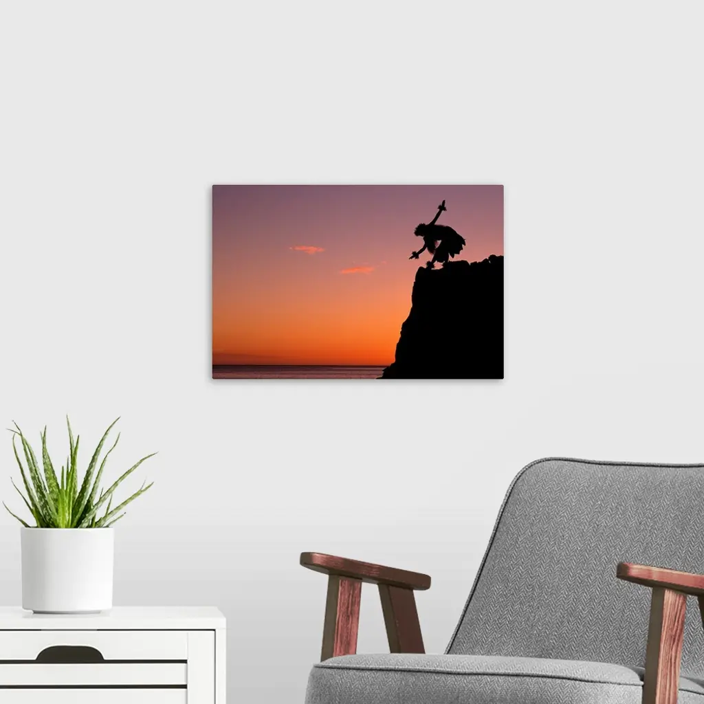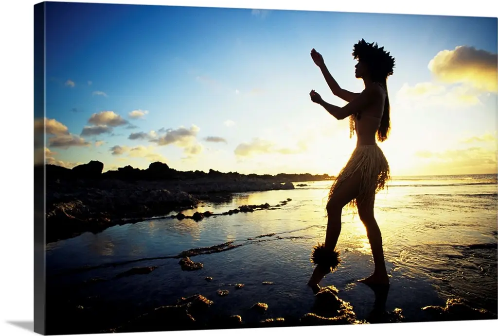 Hawaii, Female Hula Dancer Silhouetted On Cliff At Sunset wall art for home and office decor. Discover canvas art prints, photos, mural, big canvas art and framed wall art in GreatBigCanvas.com's varied collections.