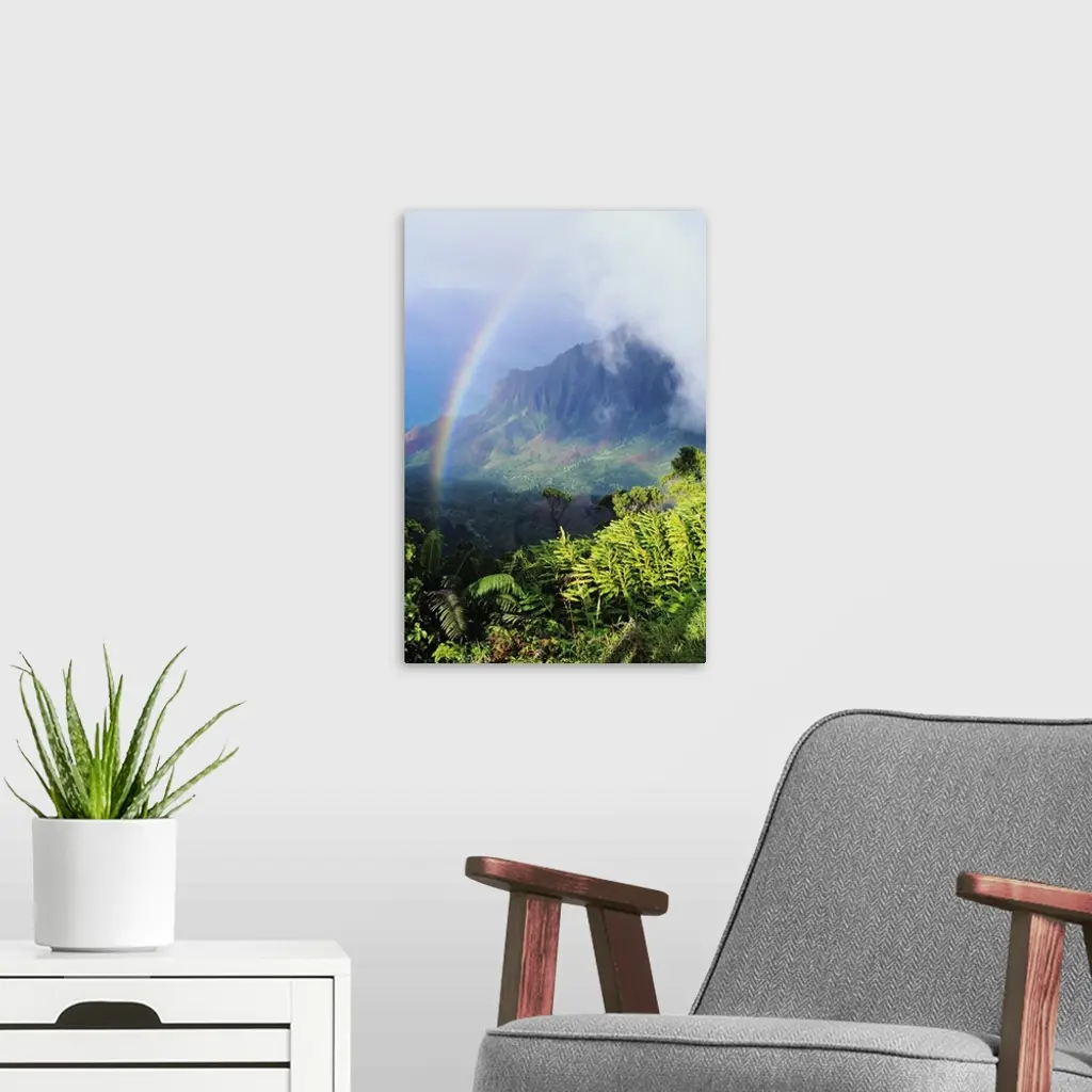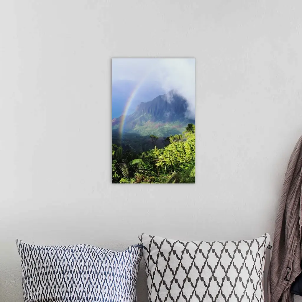 Hawaii, Kauai, Na Pali Coast, Kokee State Park, Kalalau Valley viewpoint with rainbow wall art for home and office decor. Discover canvas art prints, photos, mural, big canvas art and framed wall art in GreatBigCanvas.com's varied collections.