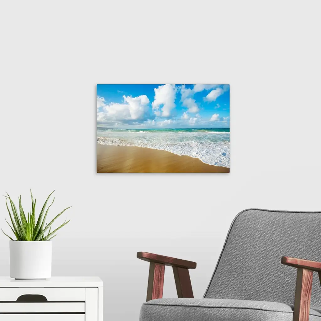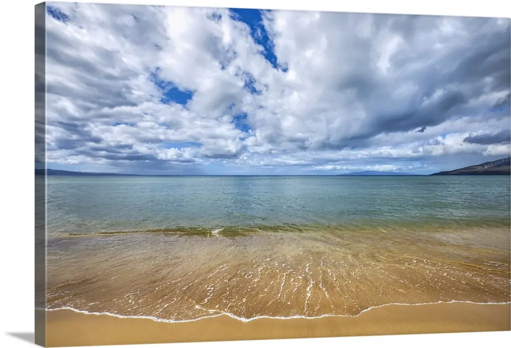 A breathtaking view of the ocean from the sands in Hawaii with large white clouds above.