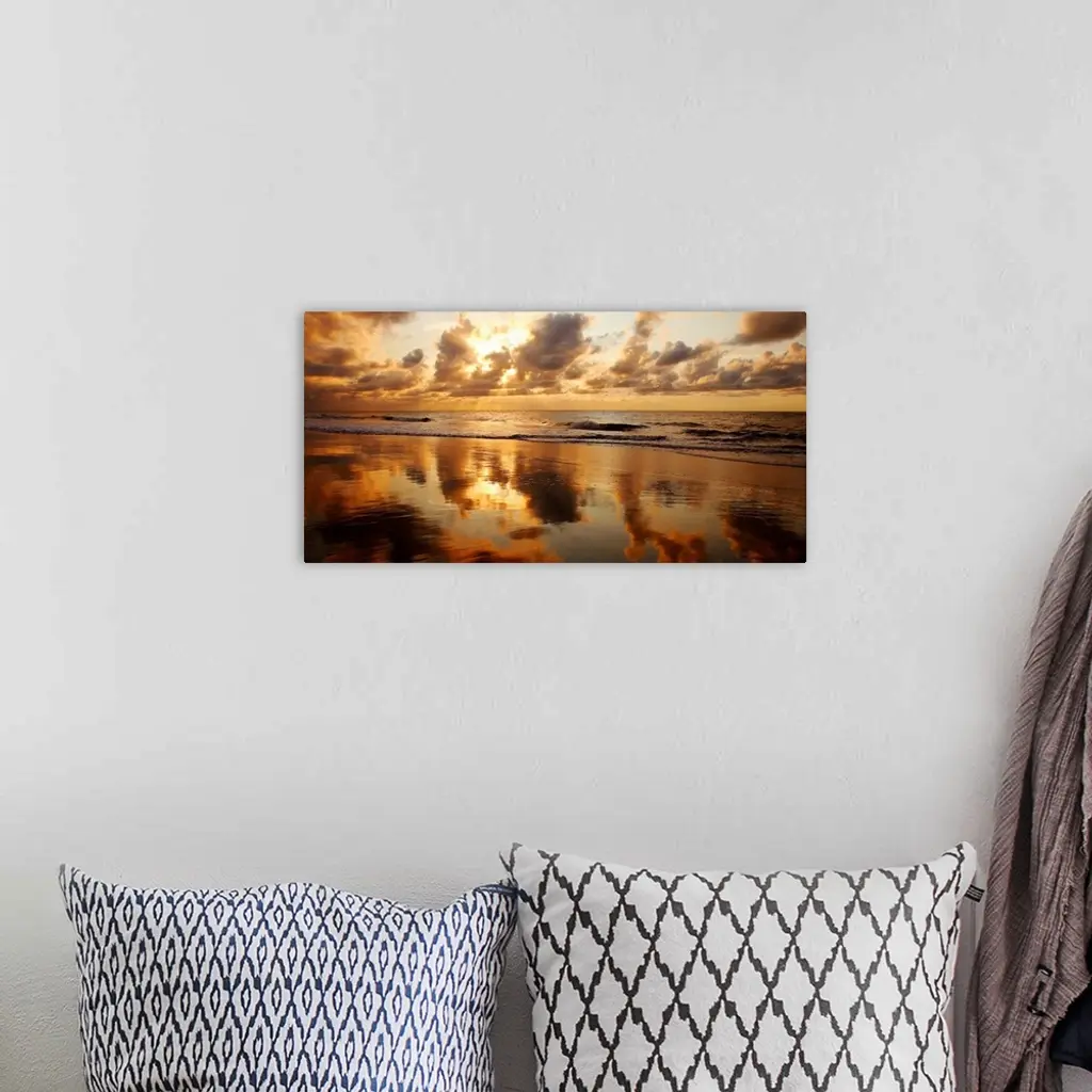 Panoramic photograph of seashore at dusk. There is standing water on the beach and waves rolling in. The dark cloudy sky is reflected in the water below.