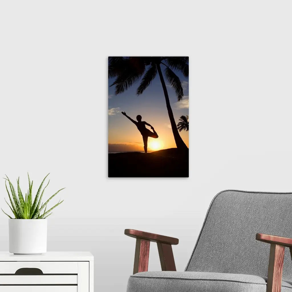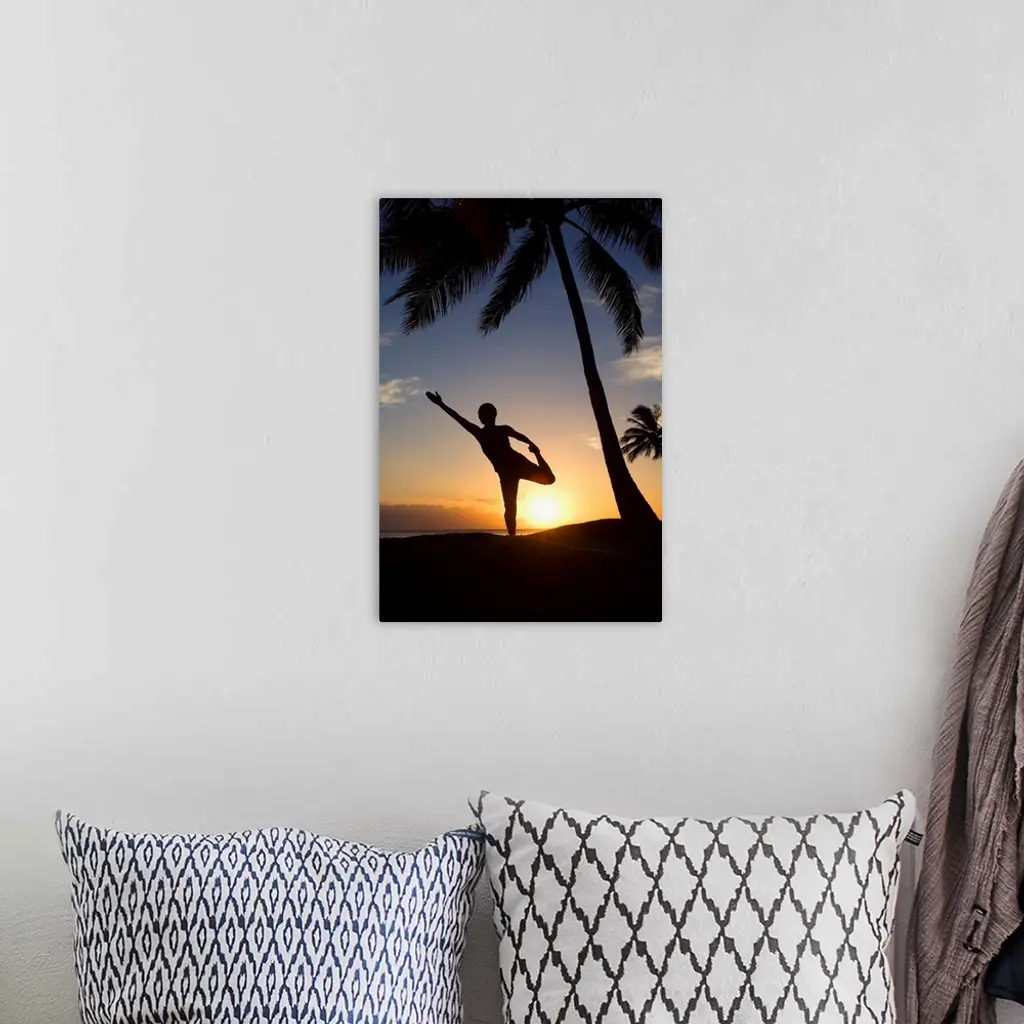 Hawaii, Maui, Olowalu, Woman Doing Yoga At Sunset Under Palm Trees wall art for home and office decor. Discover canvas art prints, photos, mural, big canvas art and framed wall art in GreatBigCanvas.com's varied collections.