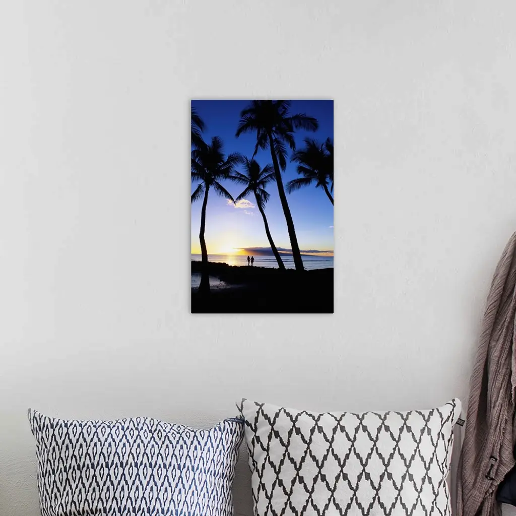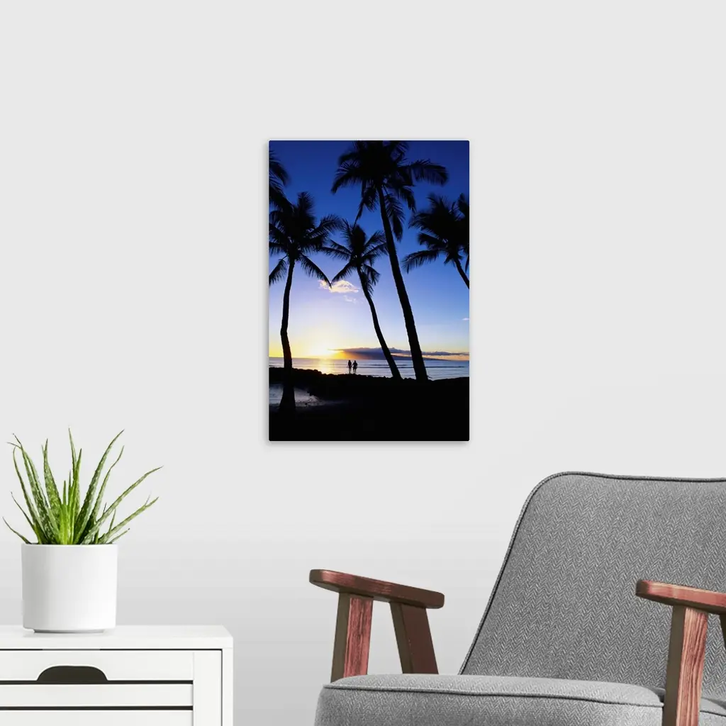 Hawaii, Maui, silhouette of couple holding hands, walking along rock wall at sunset wall art for home and office decor. Discover canvas art prints, photos, mural, big canvas art and framed wall art in GreatBigCanvas.com's varied collections.