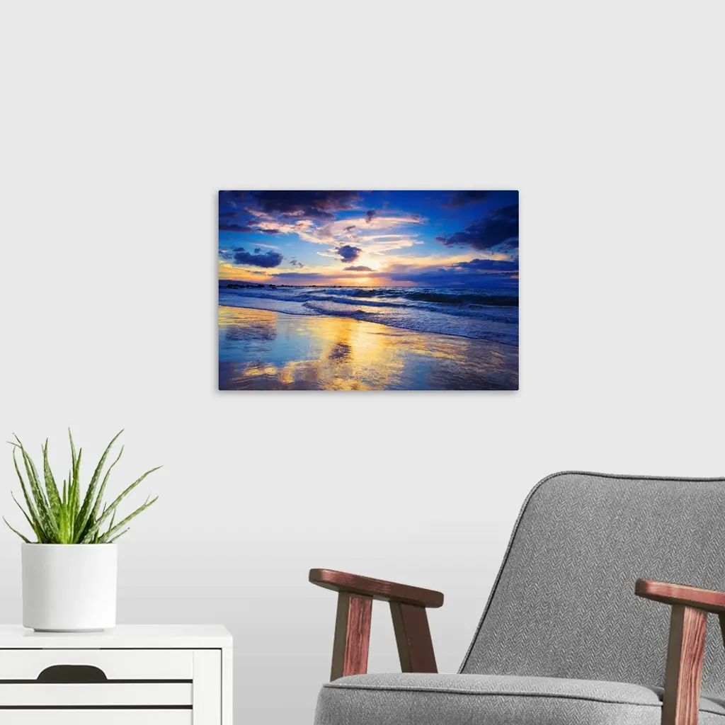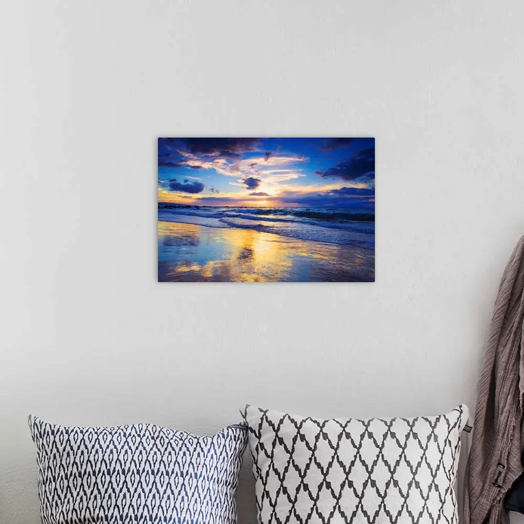 Horizontal photograph on a large wall hanging of a vivid sunset glowing through clouds, over the shore of Mokapu Beach in the resort community of Wailea in Maui, Hawaii.
