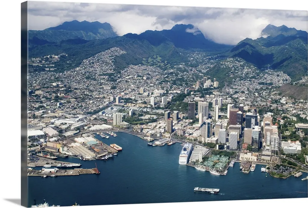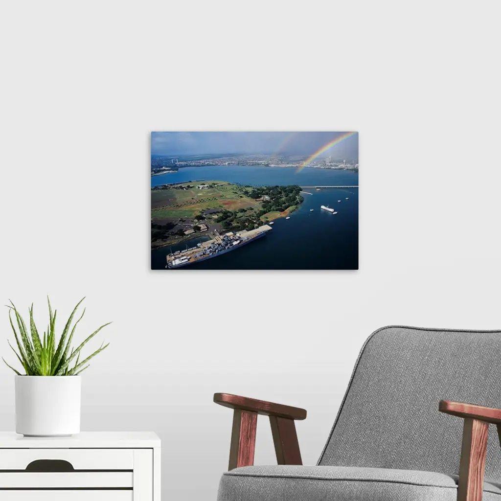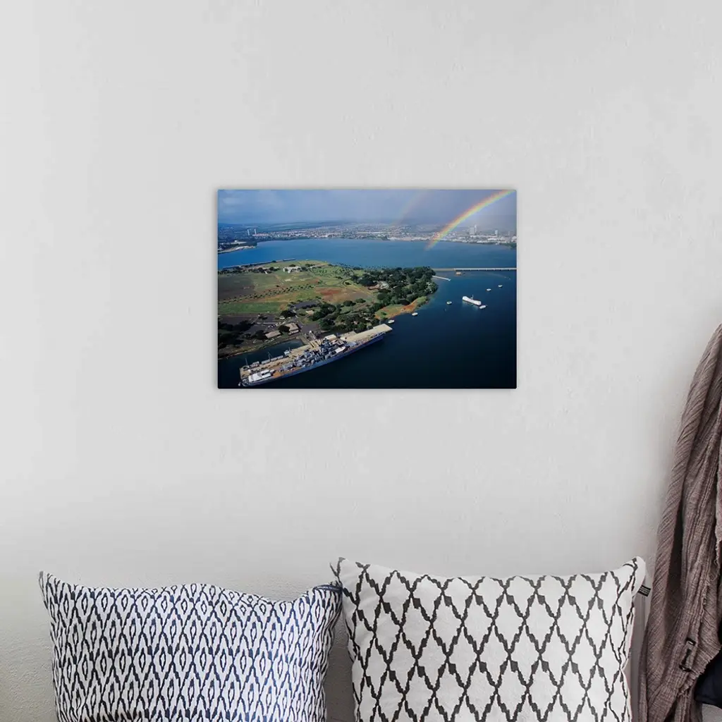 Hawaii, Oahu, Aerial Of Uss Missouri Docked At Pearl Harbour With Uss Arizona Memorial wall art for home and office decor. Discover canvas art prints, photos, mural, big canvas art and framed wall art in GreatBigCanvas.com's varied collections.